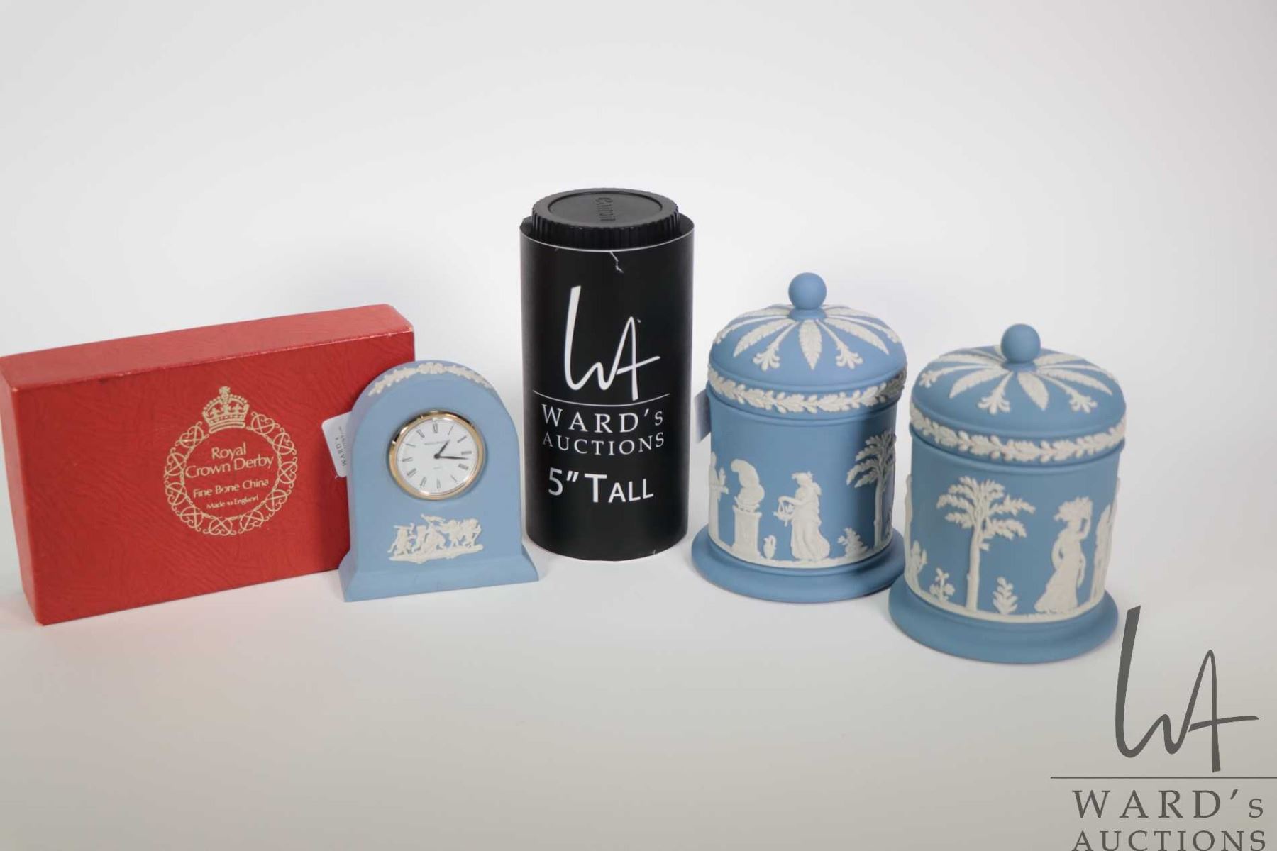 Pair of lidded jars and a small 3 1/2" clock with original box, not working at time of cataloguing