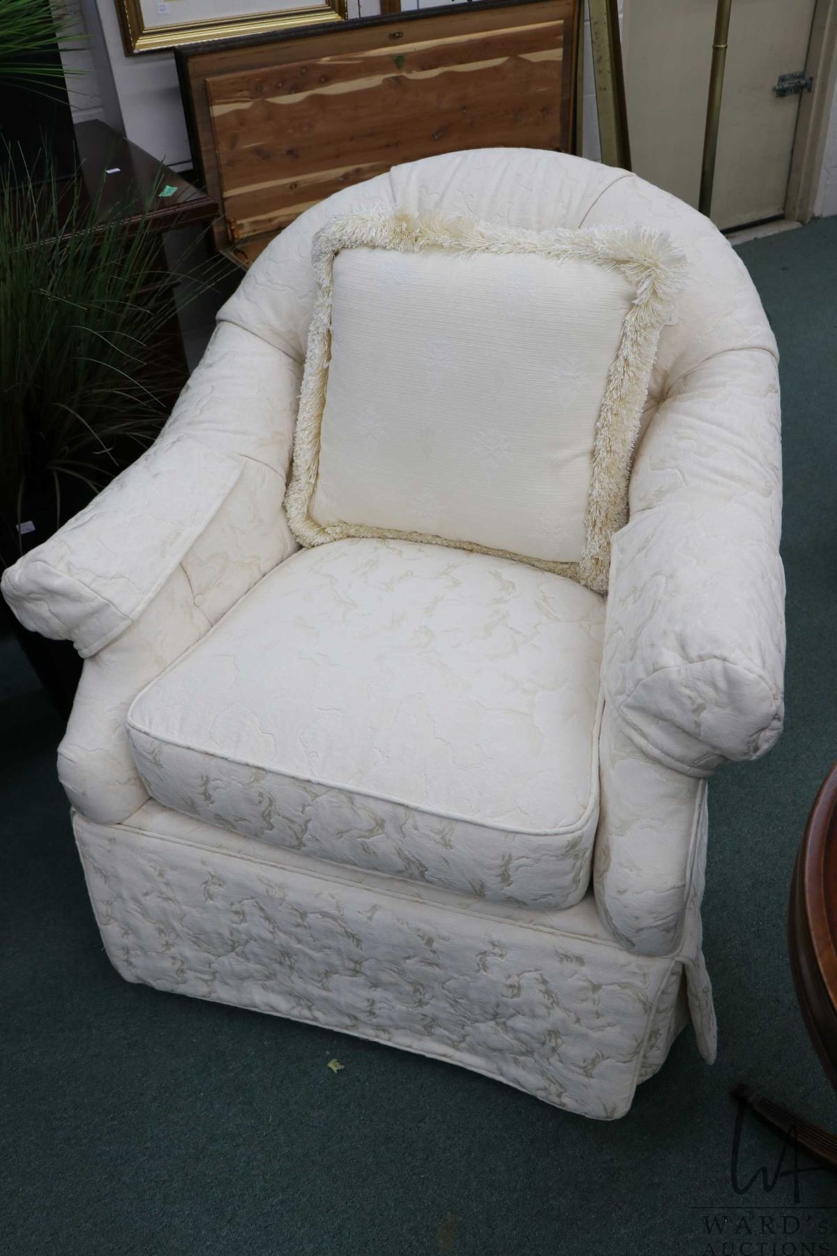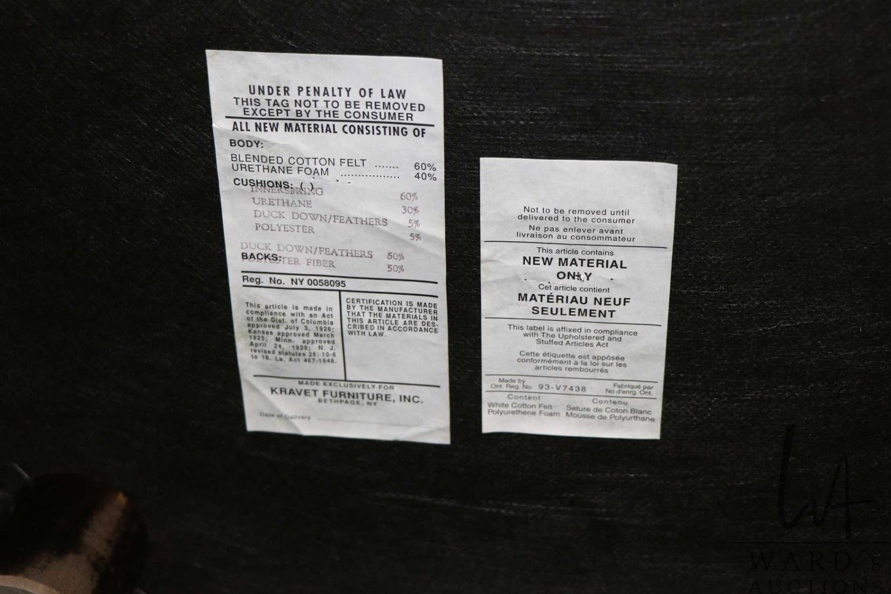Pair of matching duck down and polyester blend upholstered side chairs with throw cushions and labeled made for Kravet Furniture Co. New York