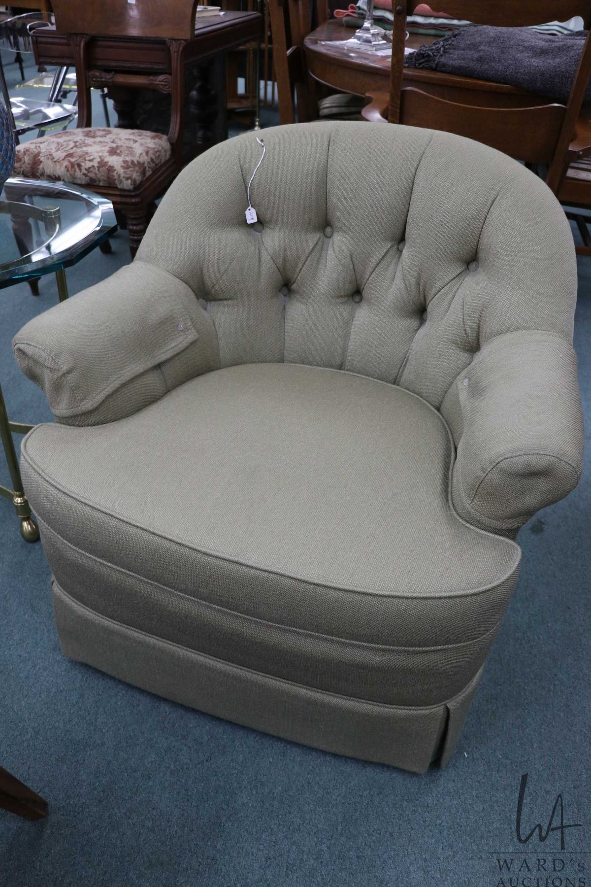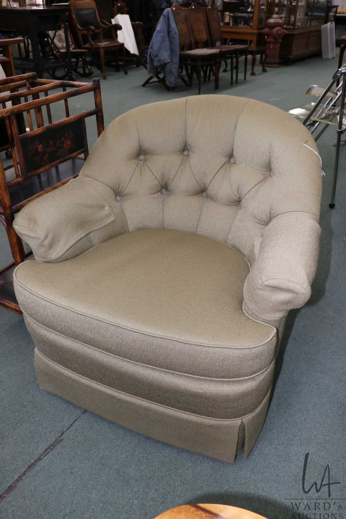Pair of matching tub style upholstered parlour chairs with button tufted backs