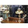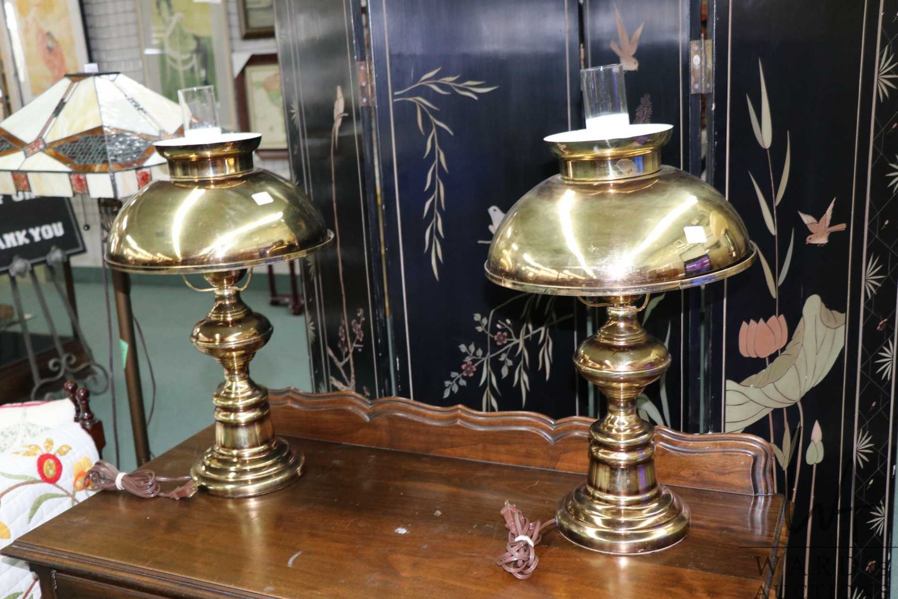 Pair of midcentury modern 1970s electric oil lamp style table lamps with hurricane shade . Note: Not available for shipping. Local pickup only