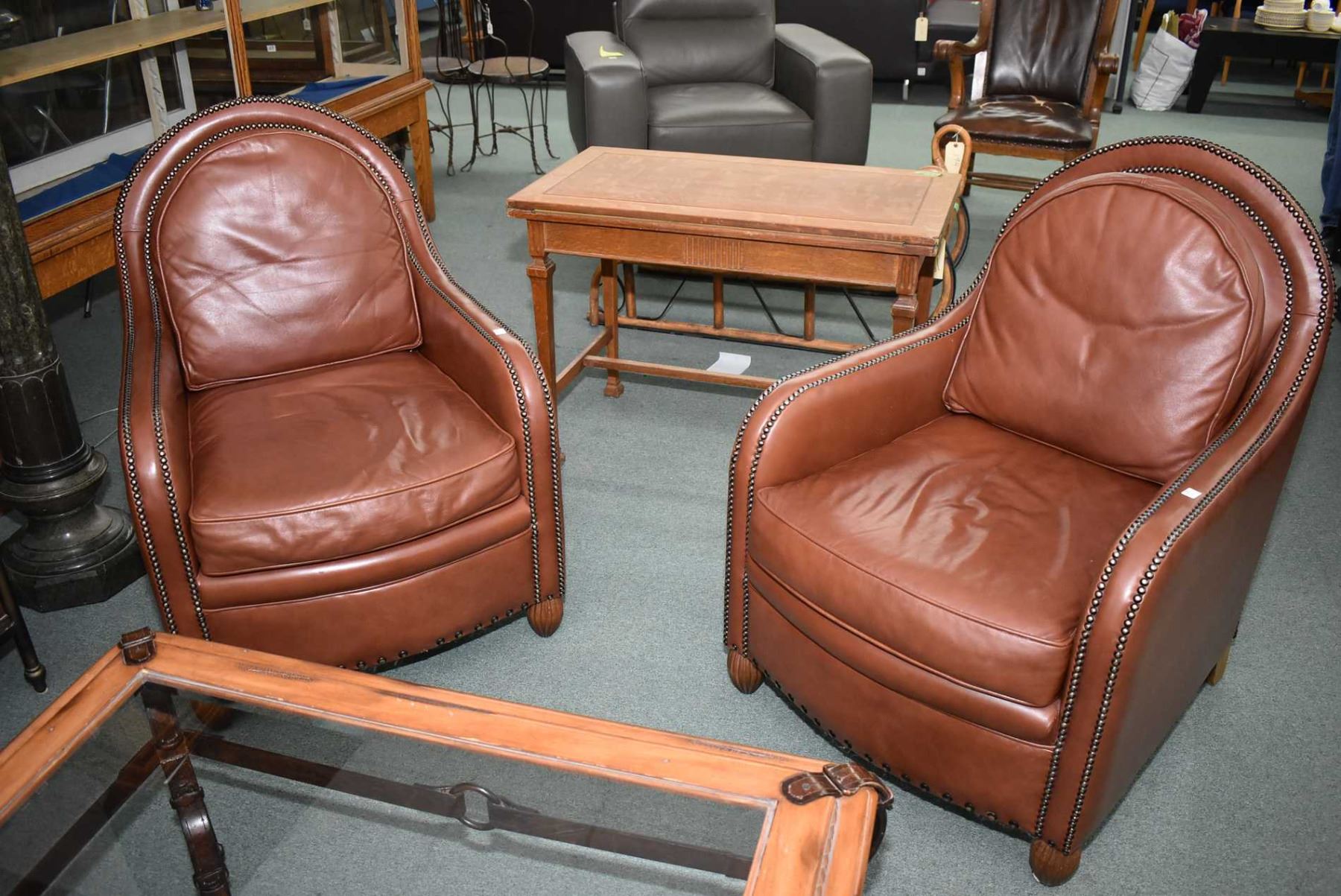 Pair of modern leather arm chairs with naihead decoration made by Elite for Finesse Furnishings