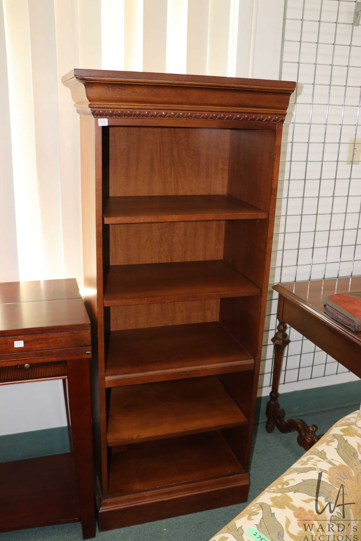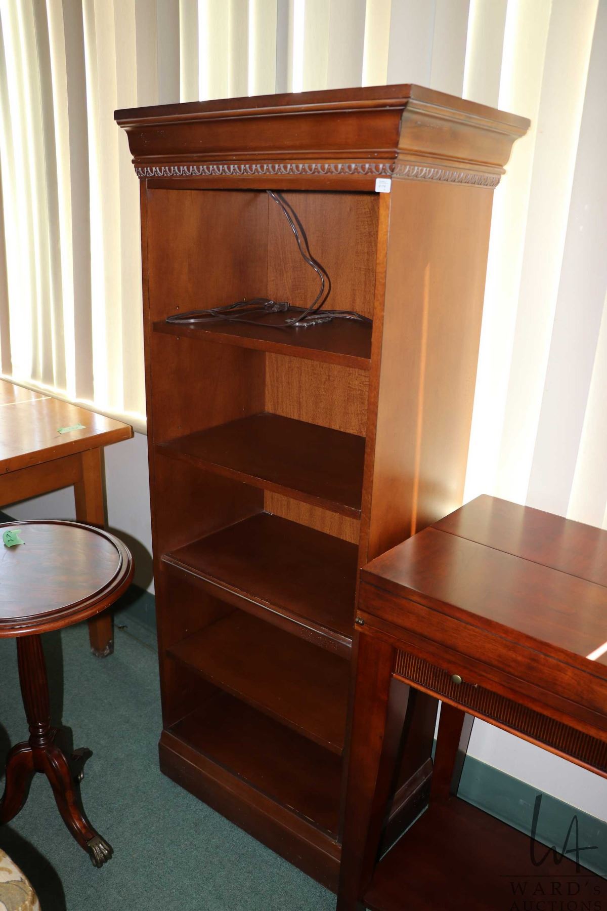 Pair of modern open display/ book shelves with two sided crown, can be used flat side to side wall or flat side towards each other, each 61" H X 25" W X 16" D