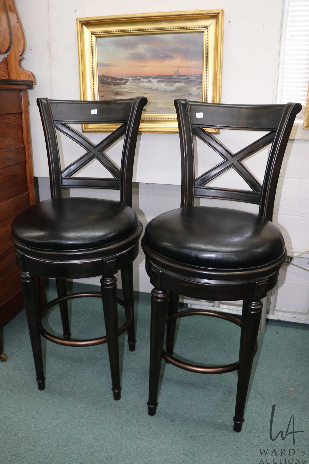 Pair of modern swivel high back bar stools with 30" H upholstered seats