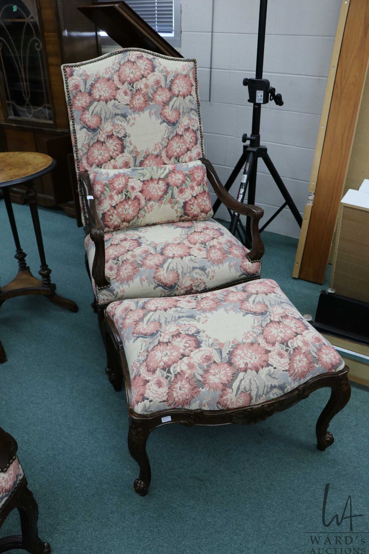 Pair of quality modern antique style open armed parlor chairs. Each with bolster pillow plus one foot stool. All in matching upholstery. Nail head decoration, carved skirts, supports and arms. Made by Heritage.