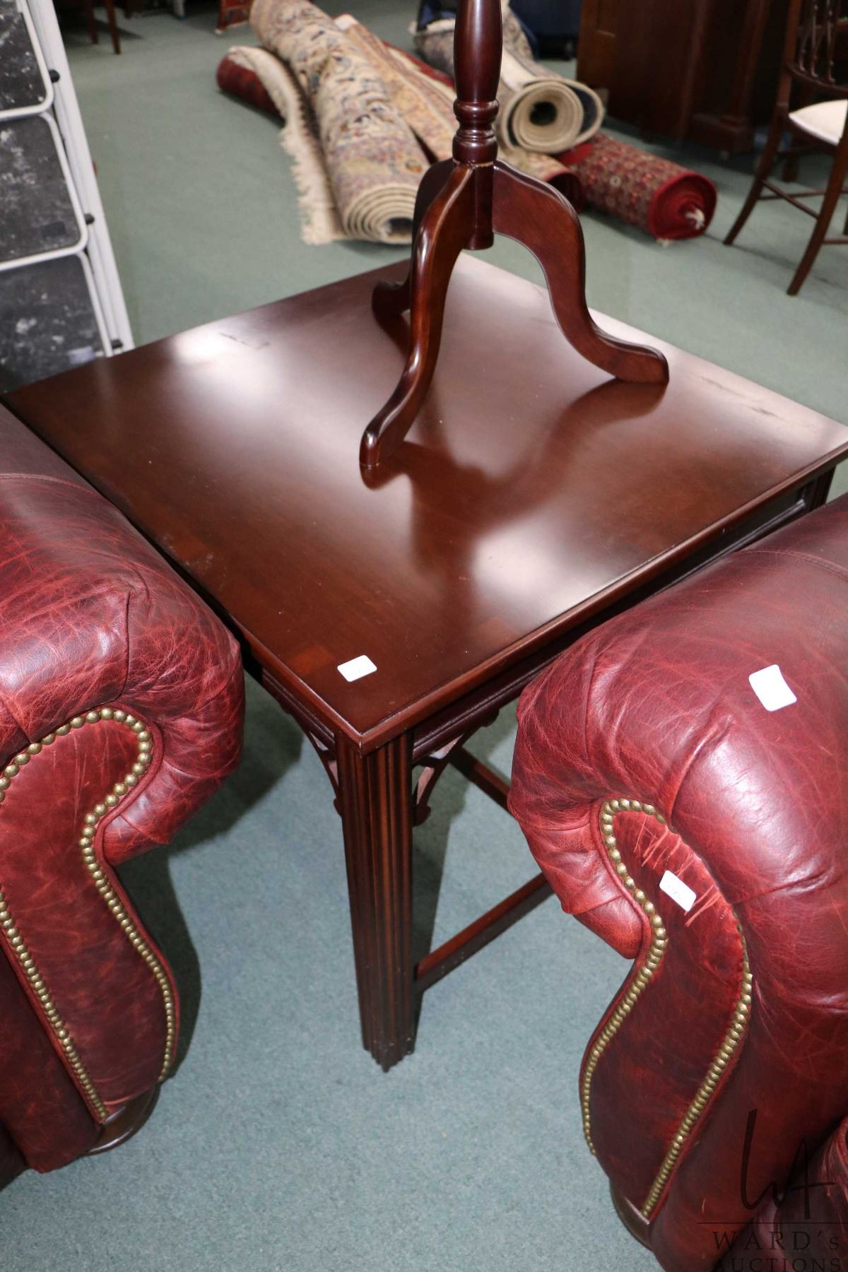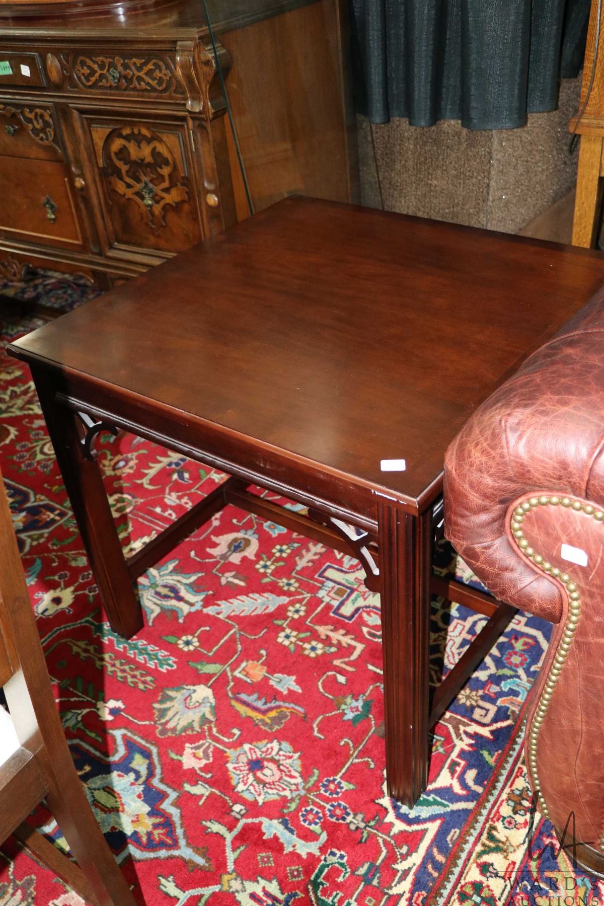 Pair of semi contemporary 27" square side tables with square reeded supports and fretwork decoration