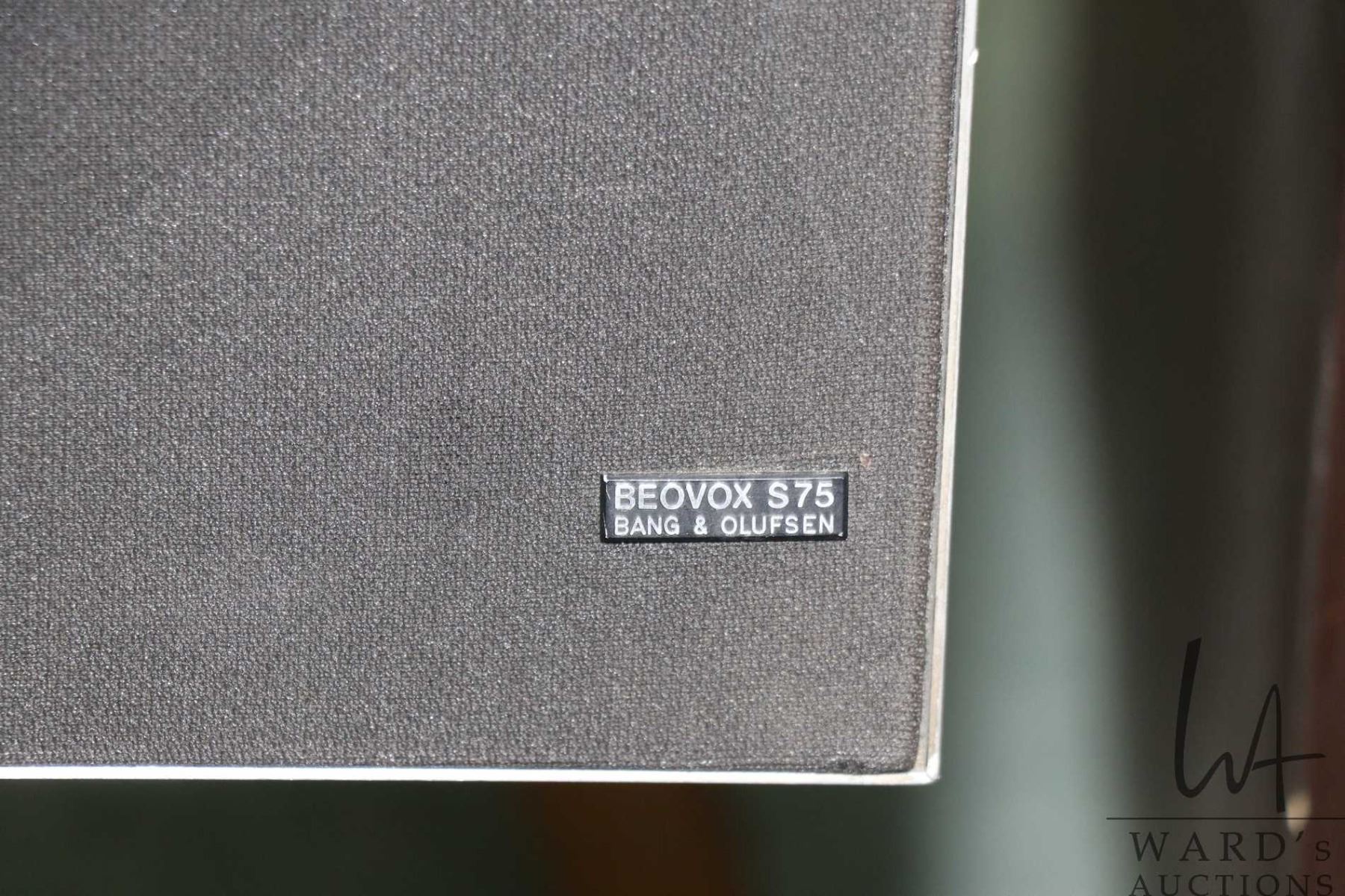 Pair of vintage Bang & Olufsen model BEOVOX S75 speakers on adjustable tilt stand and includes propriety wire, 30" in height