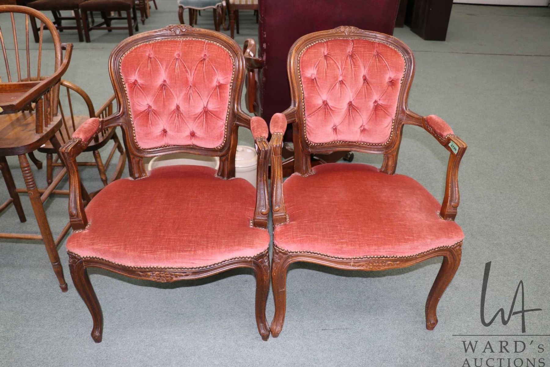 Pair of vintage French Provincial style open arm chair with carved show wood and tufted upholstered back