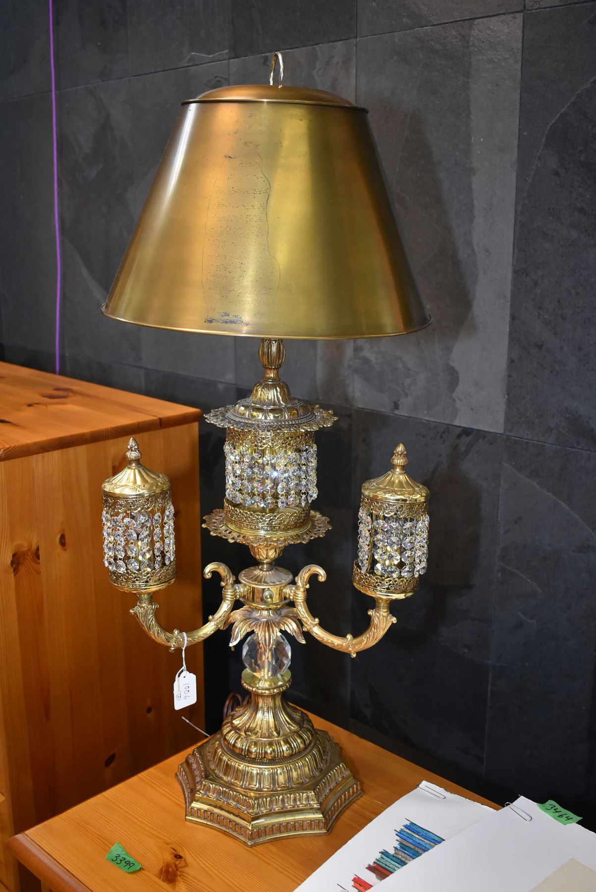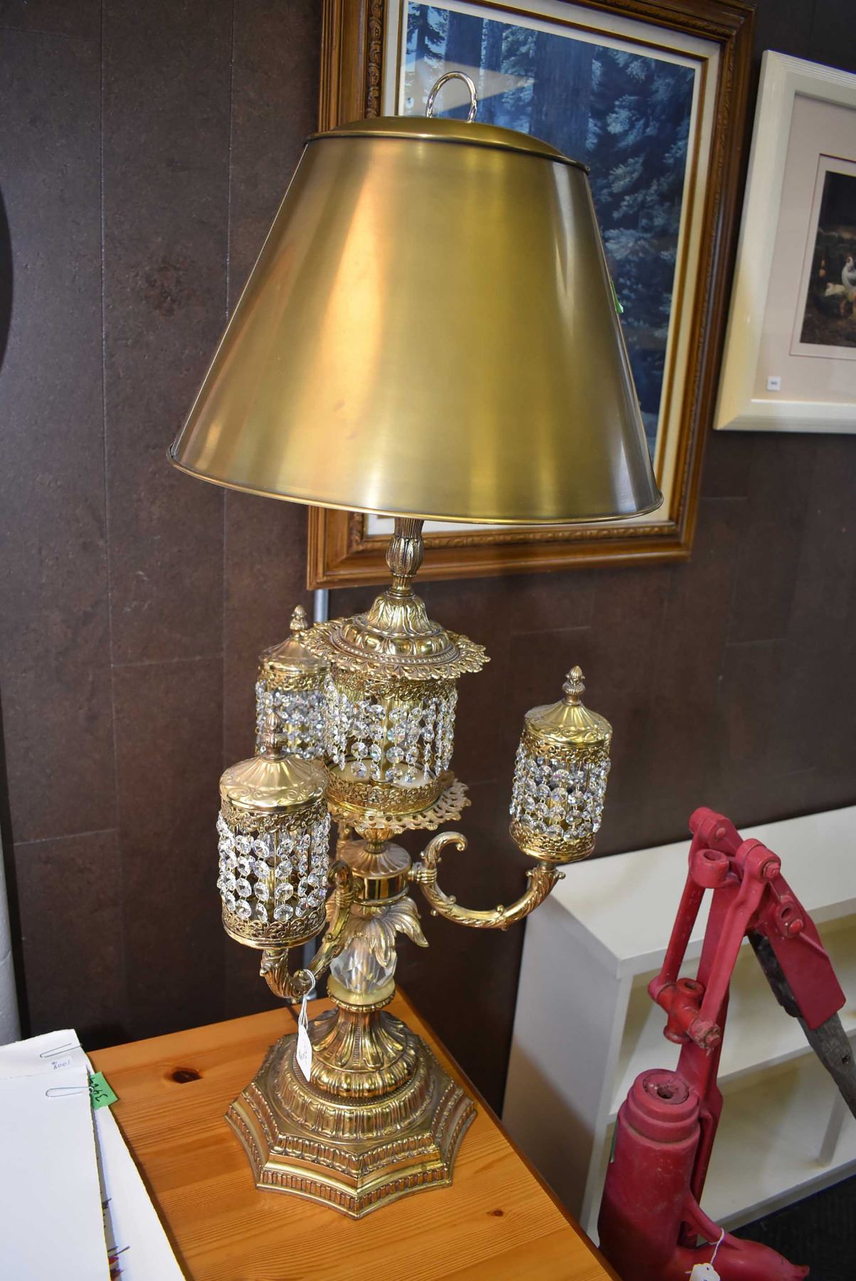 Pair of vintage brass and glass electric table lamps with light up branches with decorative hanging lustres