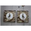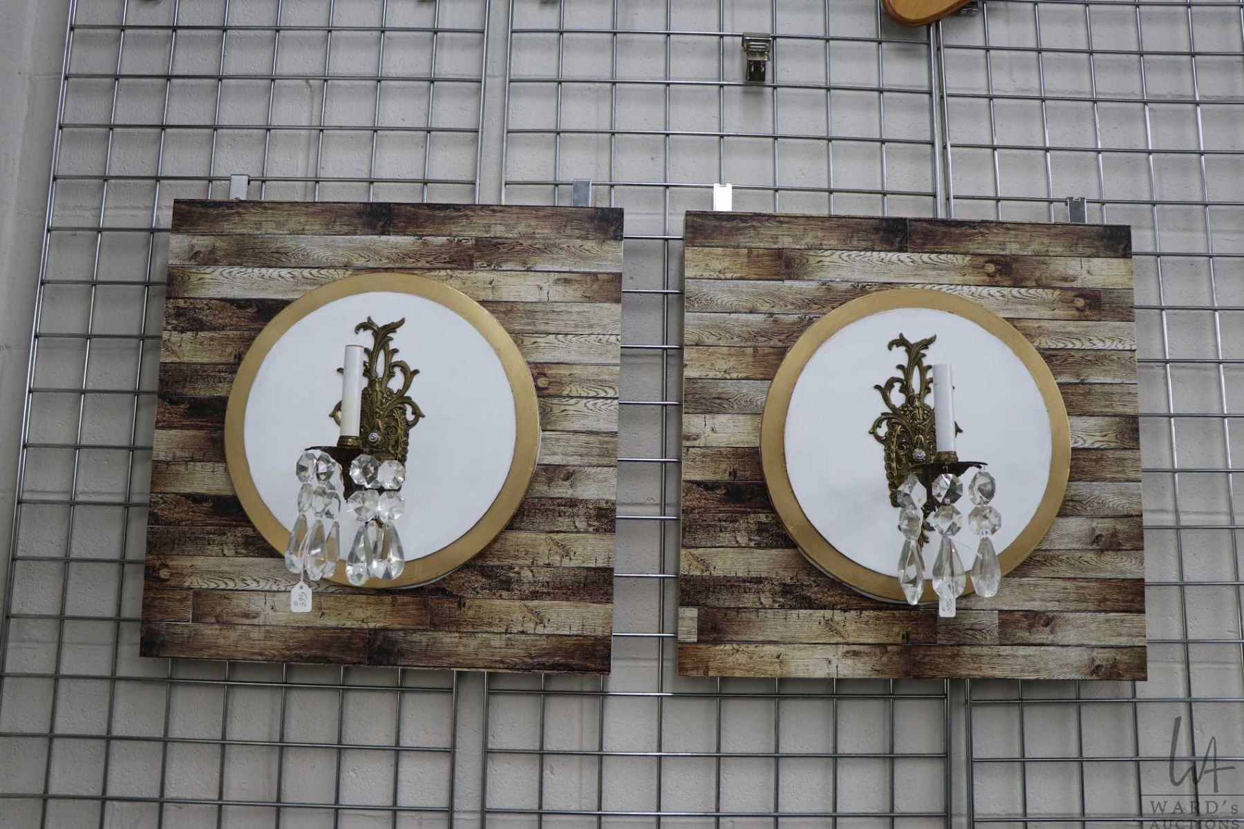 Pair of vintage single branch wall mount candle holders with hanging lustres up cycled and mounted on wood like wall mount plaques, note no longer operate as lights, 24" X 24"