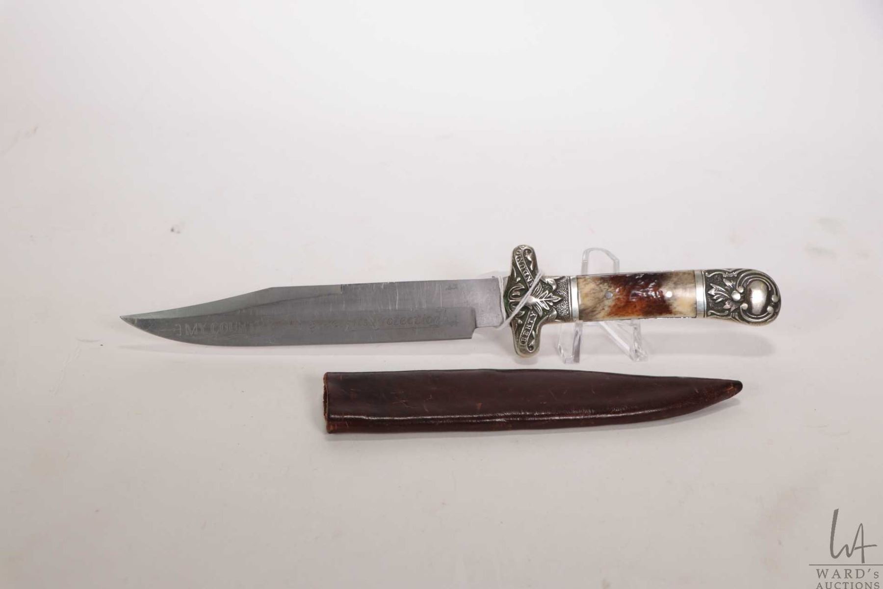 Parker Bowie knife with etched "My Country, My Steel, Its Protection" engraved on a 6 1/4" blade, stag and engraved silver handle also marked "Liberty and Union" with leather scabbard