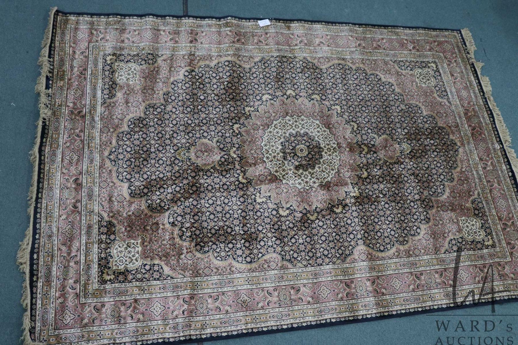 Persian style decorative area carpet with center medallion on pink/ cream background and highlights of black, gold, green etc. 77" X 113". Note: This lot is not available for shipping. Local pickup only