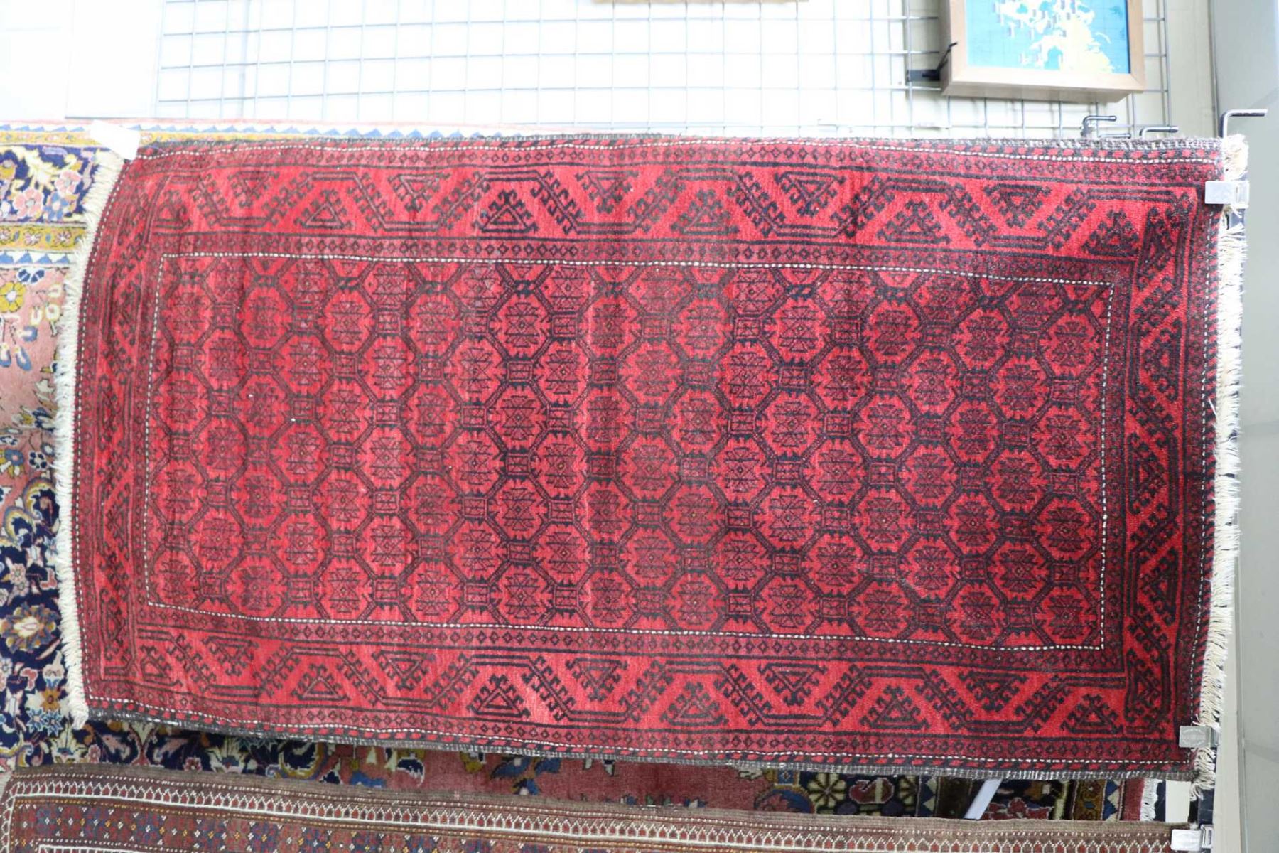 Persian wool carpet with red background, geometric center panel and border in black and cream, 39" X 68"