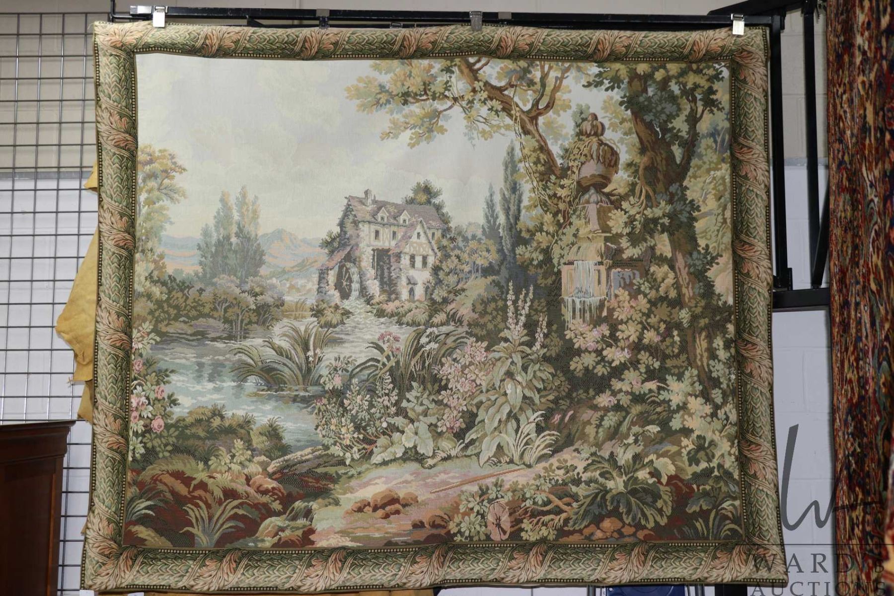 Pictorial tapestry featuring a millhouse in woodland surroundings, 78" X 61"