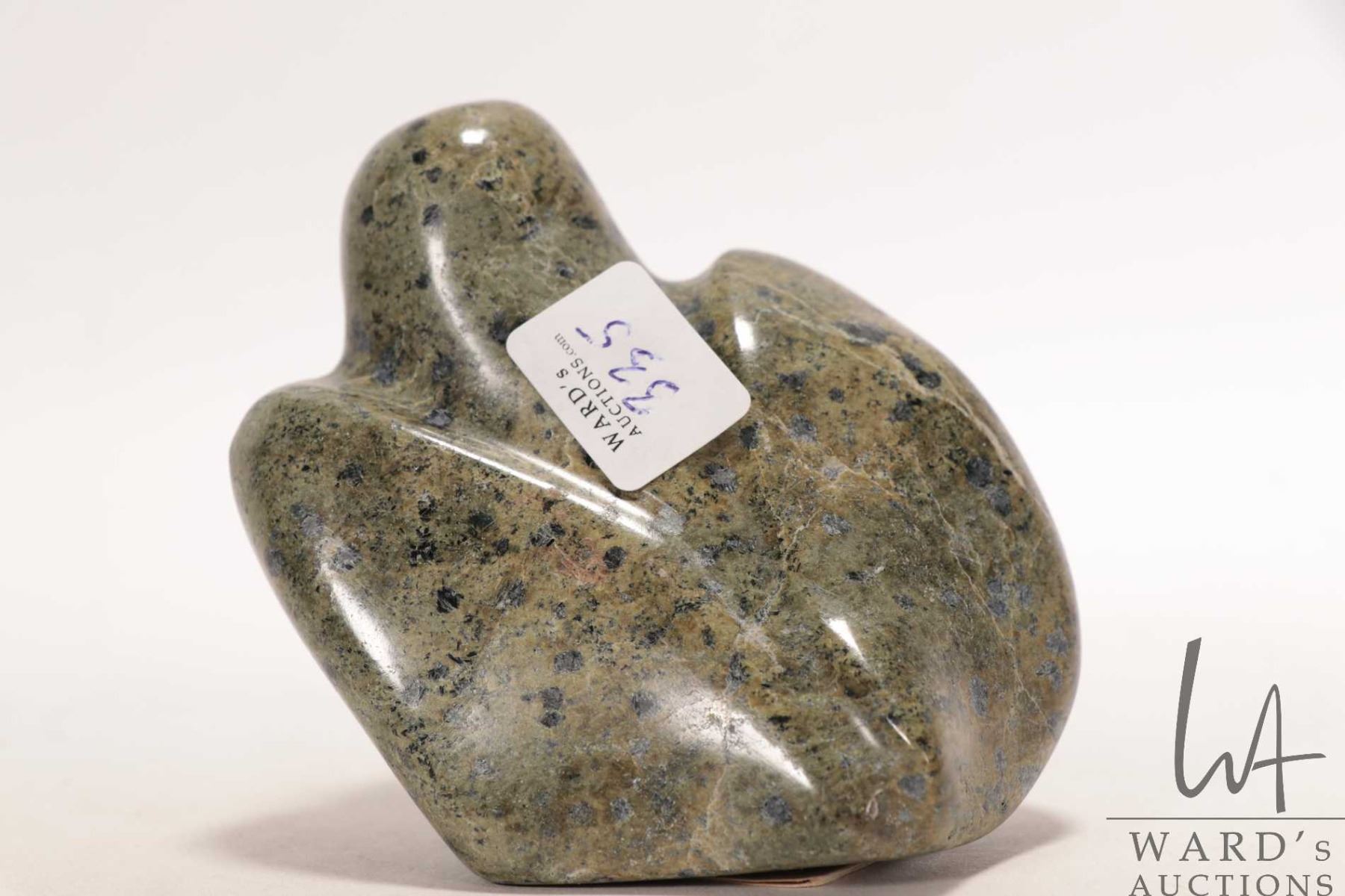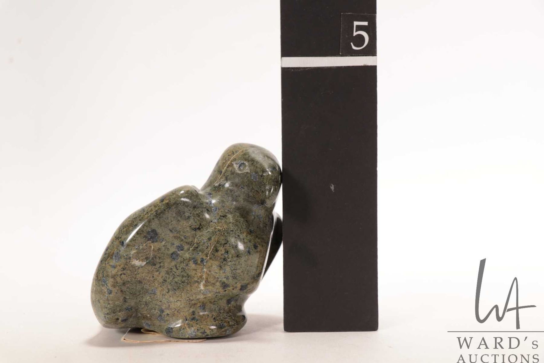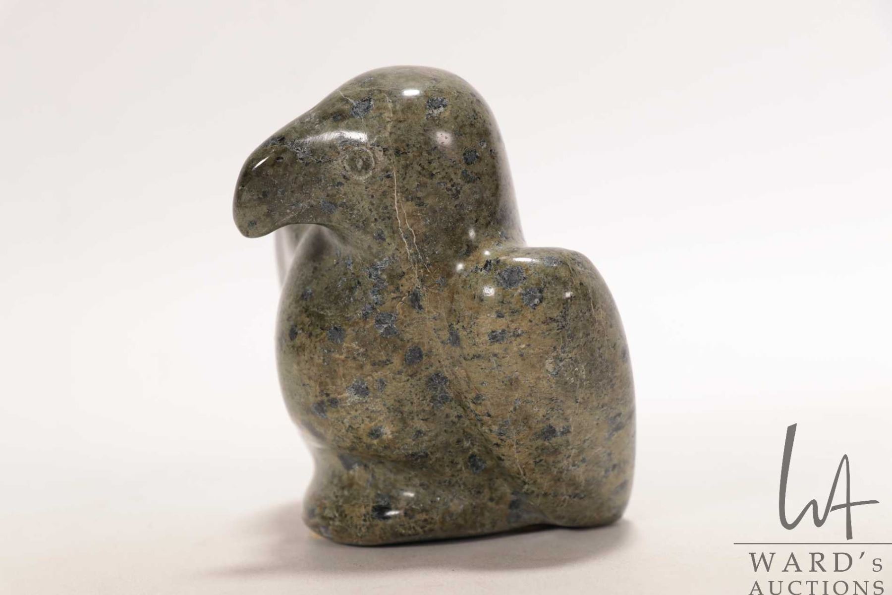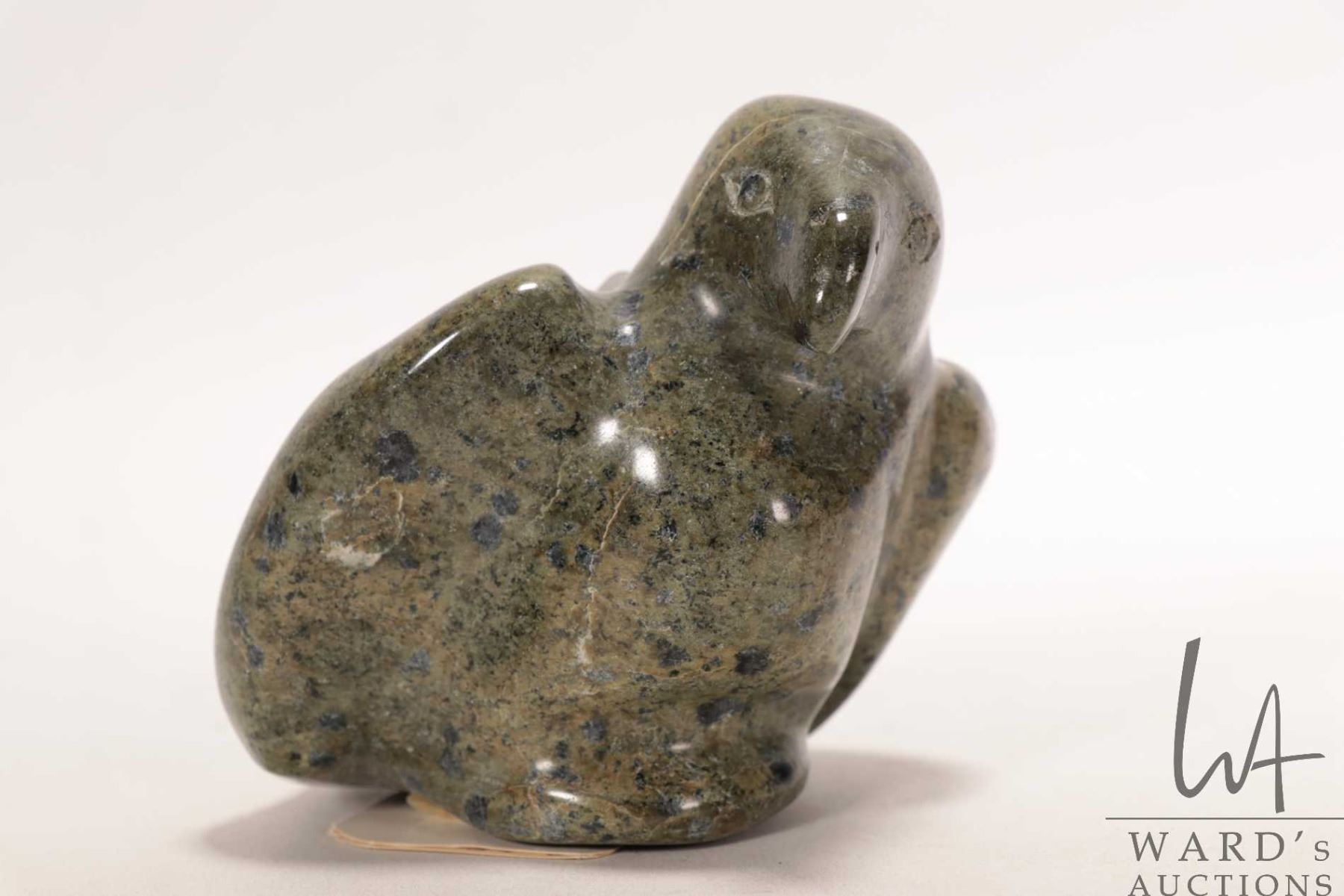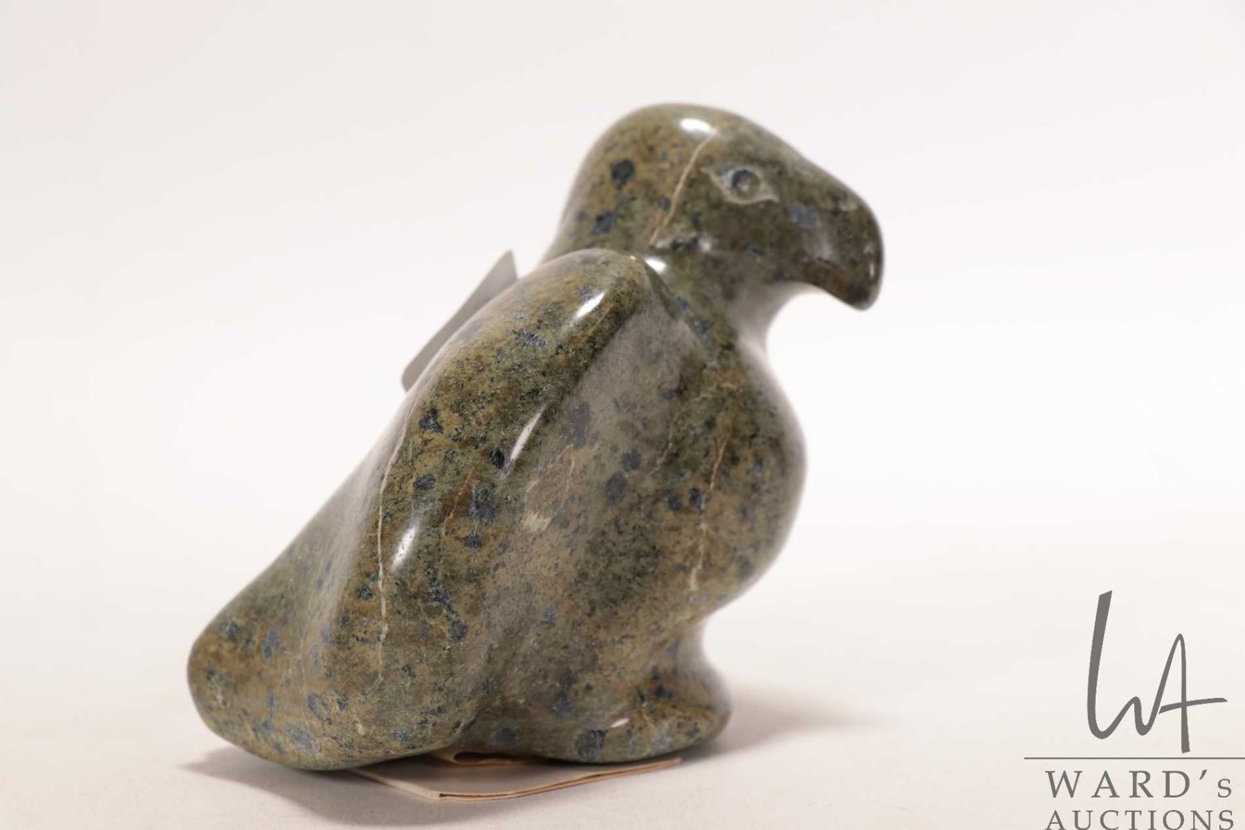 Pio Kopak, Repulse Bay, Inuit soapstone carved bird with Canada Eskimo Art label, no. 99085682, 3 1/2" in height