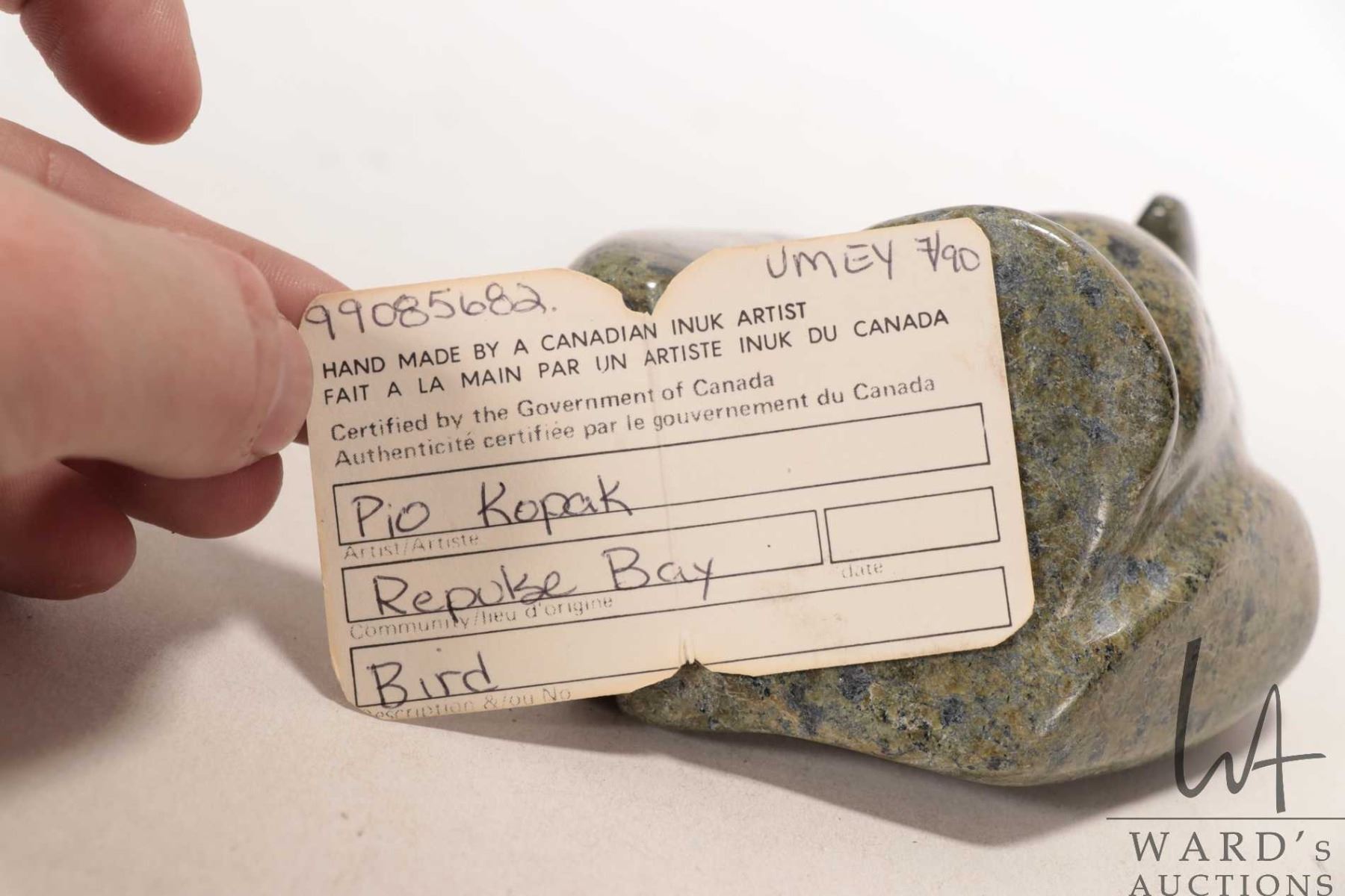 Pio Kopak, Repulse Bay, Inuit soapstone carved bird with Canada Eskimo Art label, no. 99085682, 3 1/