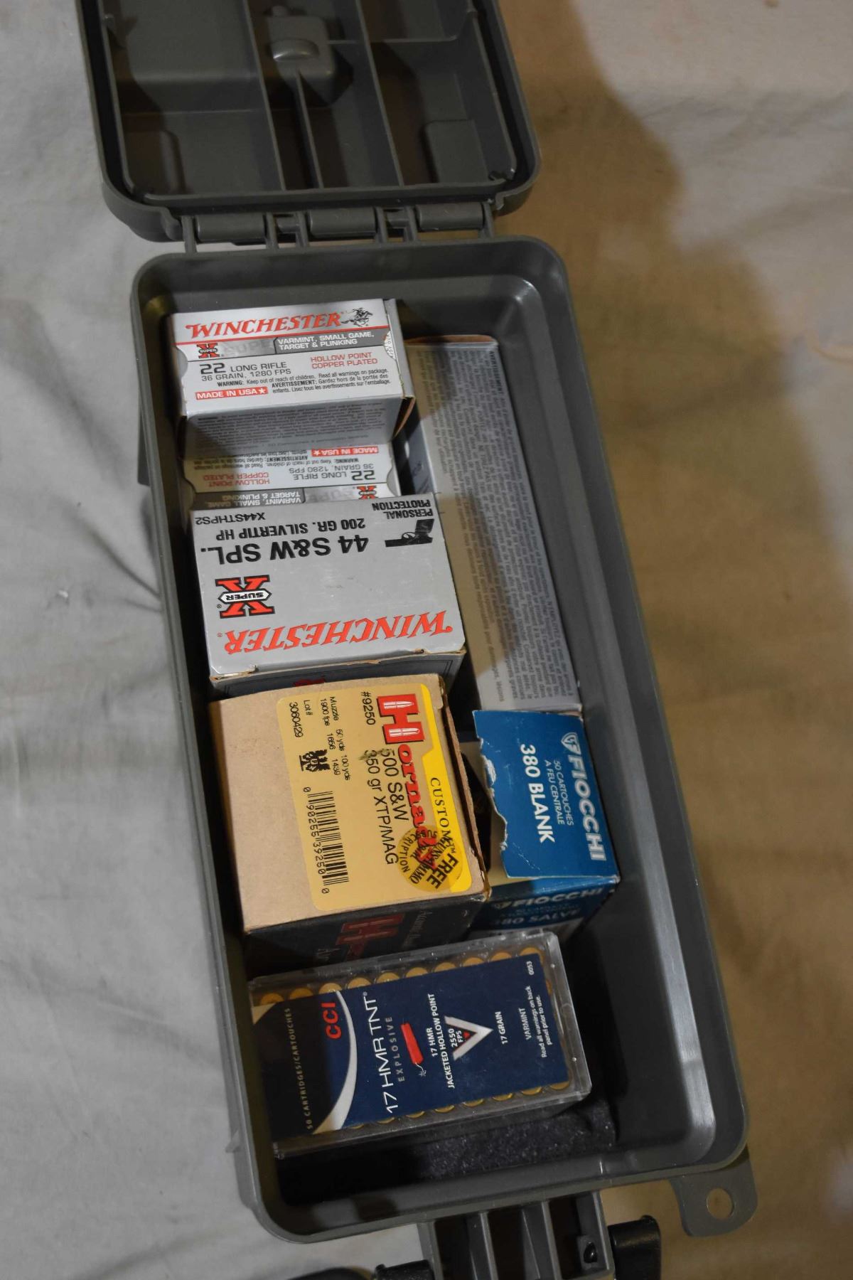 Plastic Ammo Box : Half Full of Various Primers - One Box .32 S & W Cal Ammo - 5 Boxes .22 LR Cal Ammo - One Box .17 HMR Cal Ammo - One Box .44 Spec Cal Ammo - Part Box .380 Blanks - One Box ( 25 rnds ) .500 S & W Cal Ammo