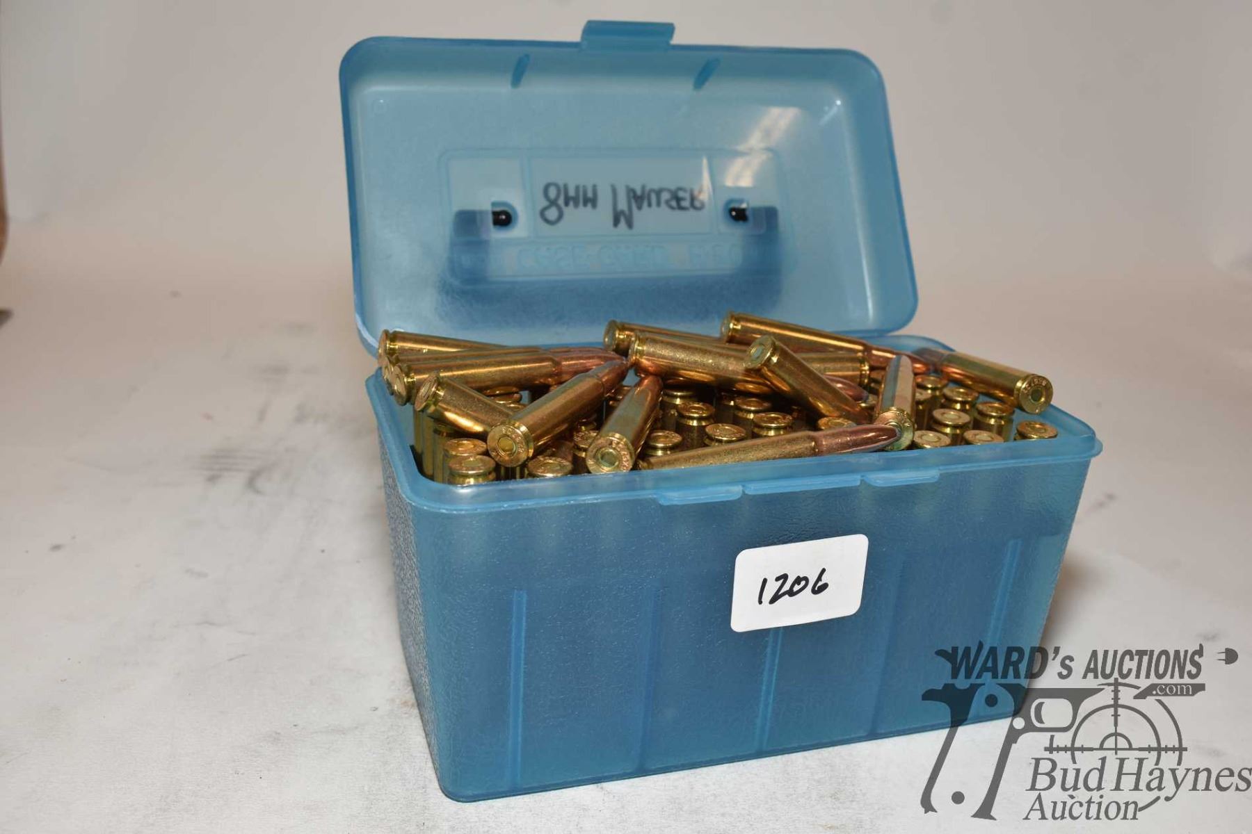 Plastic ammo box w/ 65 rounds of 8mm x 57 (mauser) reloads