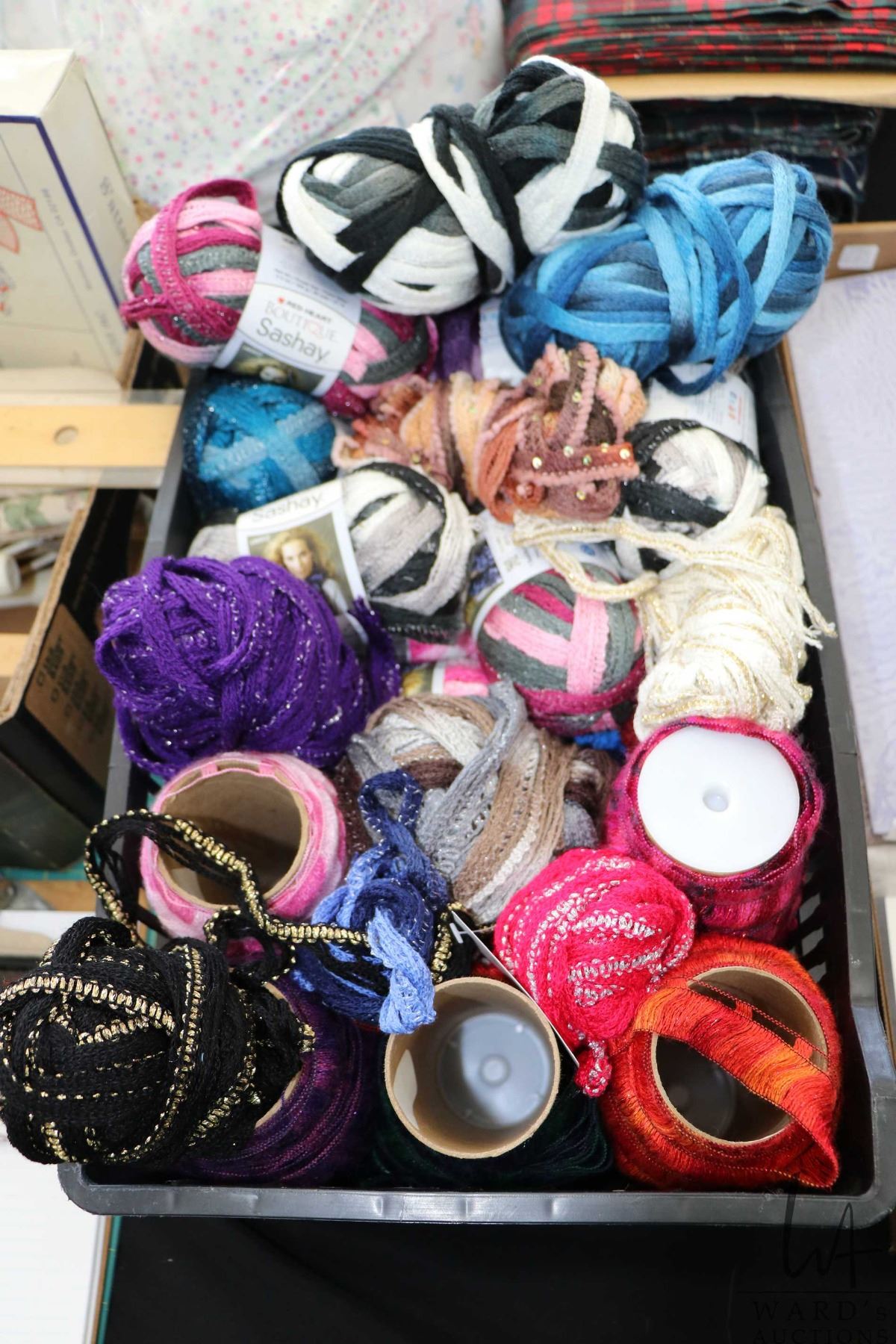 Plastic tote containing Red Heart Bouquet Shashay, scarf making yarn etc.