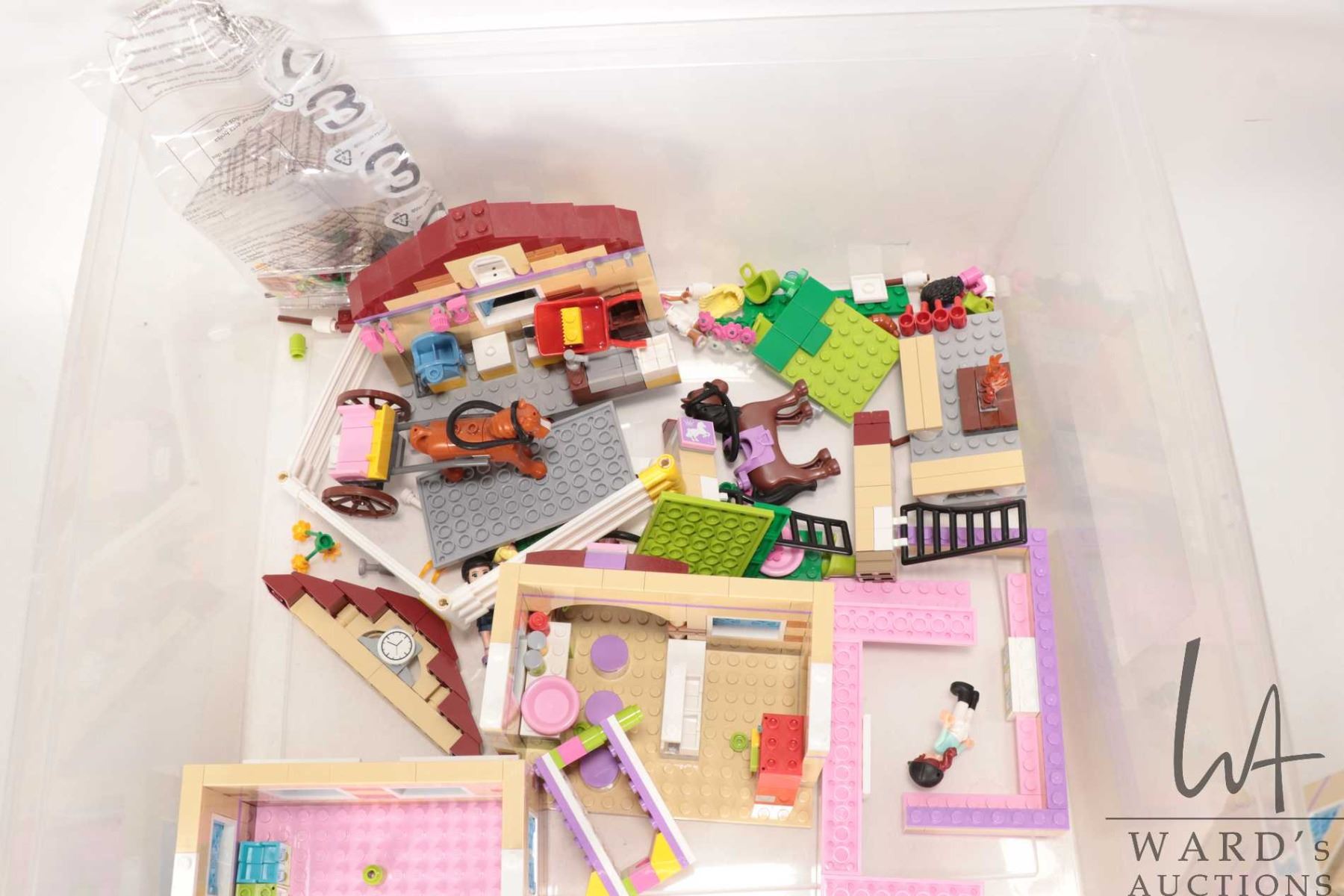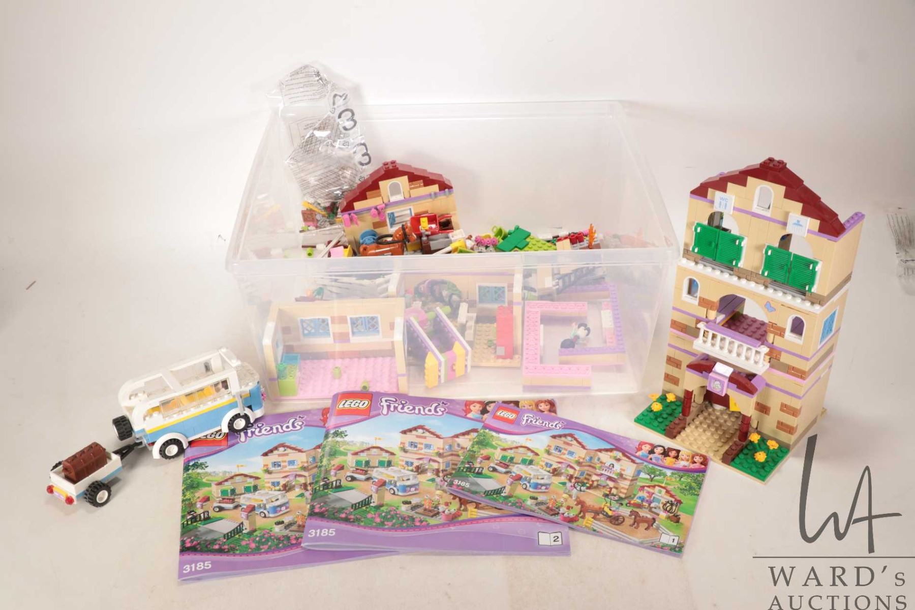Plastic tote containing no. 3185 Lego "Friends" Summer Riding Camp pre-built kit, two Lego Friends b