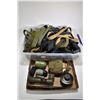 Plastic tub containing vintage and surplus webbing including belts, pouches etc. and a tray with small scope, military flashlight, survival kit etc.