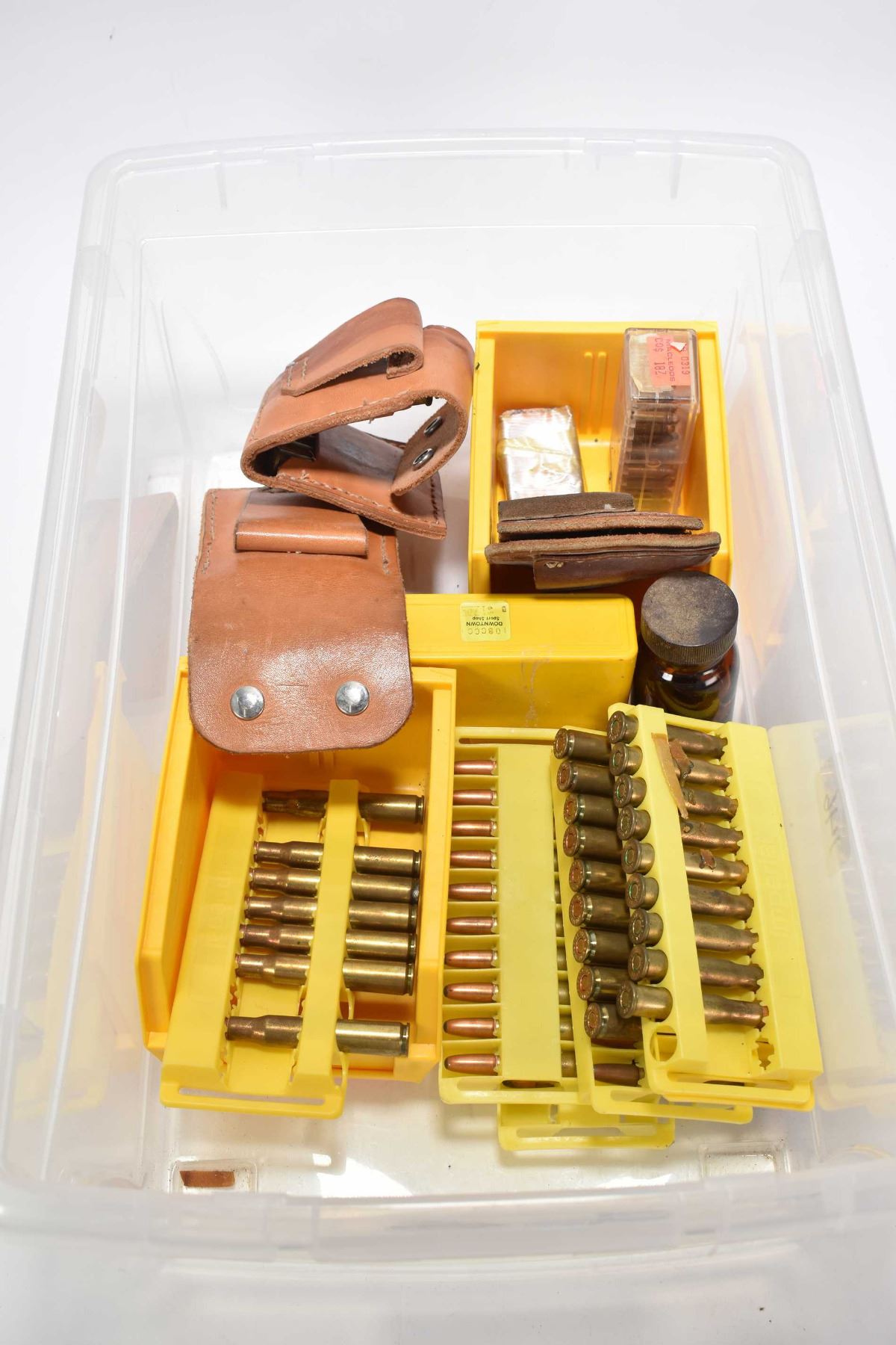 Plastic tub with a selection of 30-30 and 30-06 ammo including approximately 60 rounds plus leather ammo pouches and a small selection of .22 ammo.