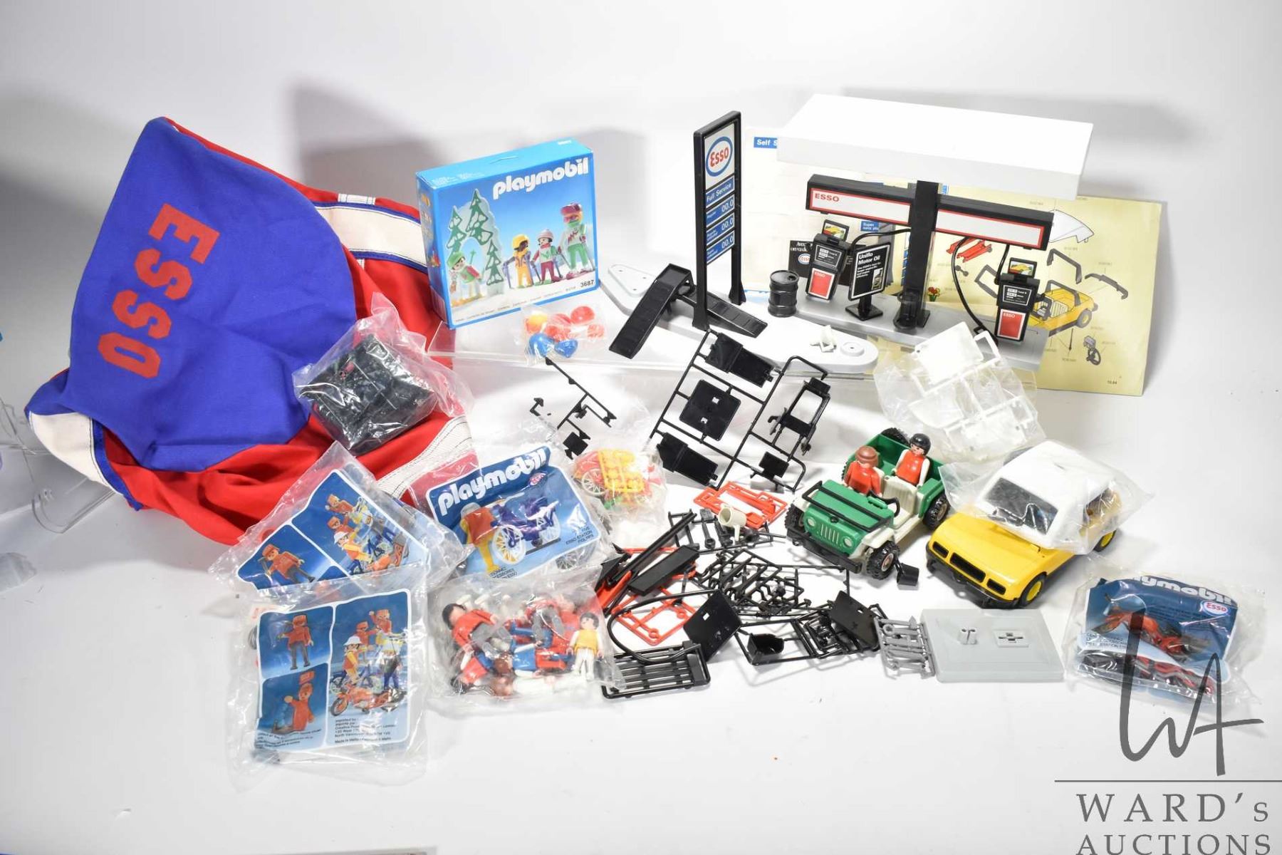 Playmobil Esso service station set and sports bag. Plus 5 Playmobil figure sets in box