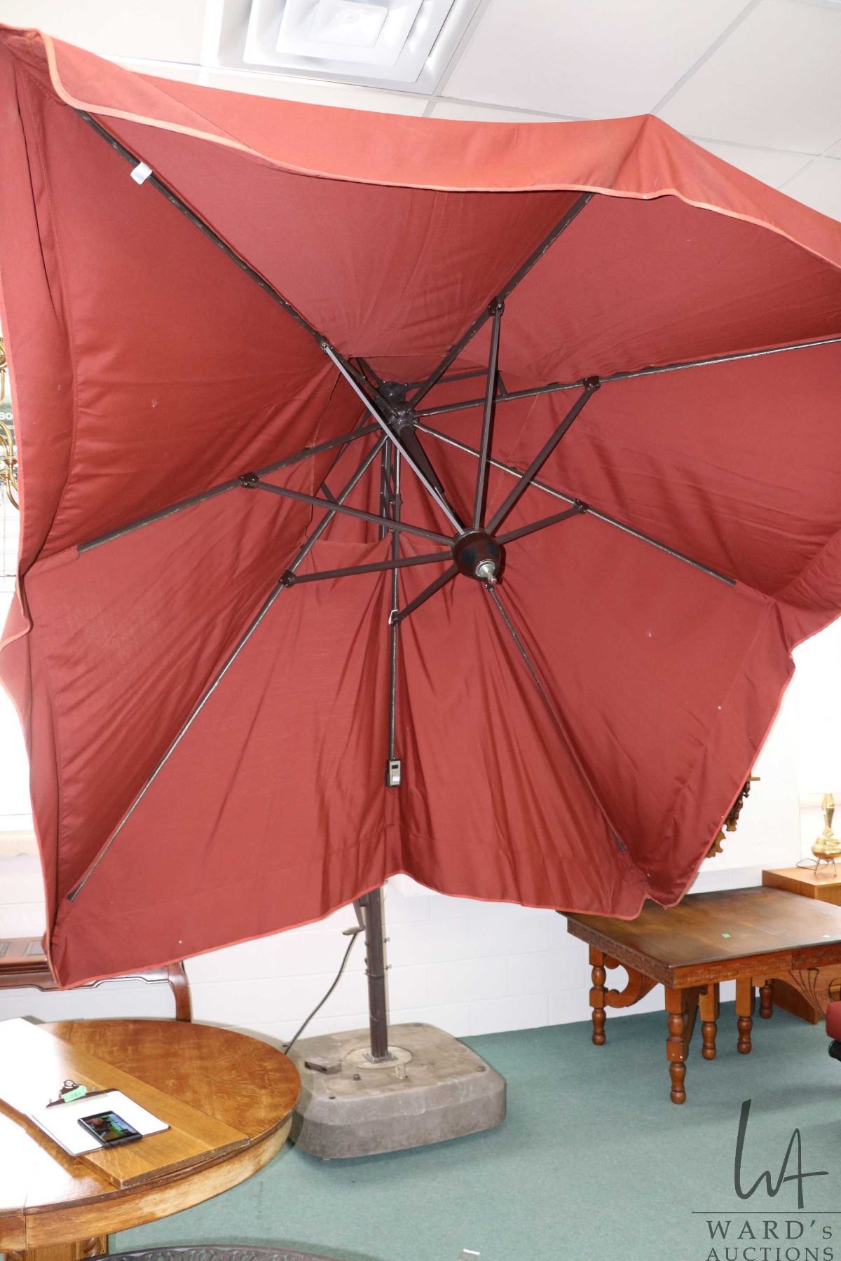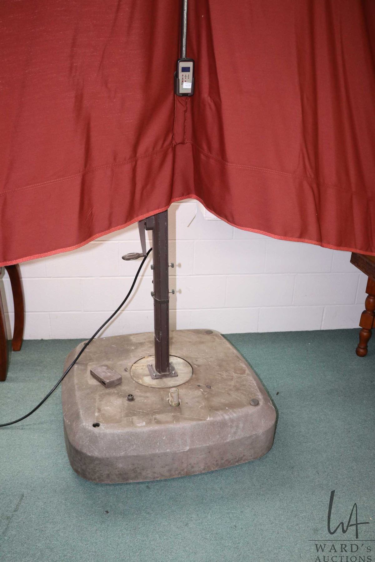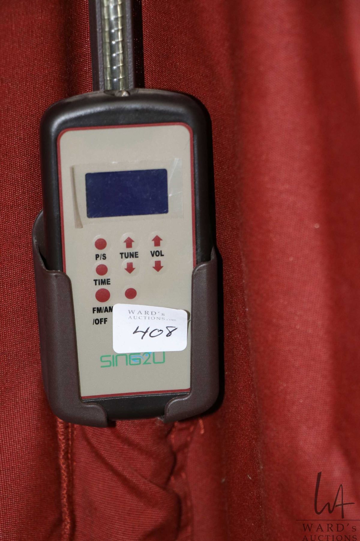 Portofino SING 2 U Series patio umbrella with built in speaker, radio and feed for external music source, center light and LED strip lighting, includes remote, 10' in diameter, note missing lens for center light. Originally purchased from Beachcomber Hot Tub for $1,700.00