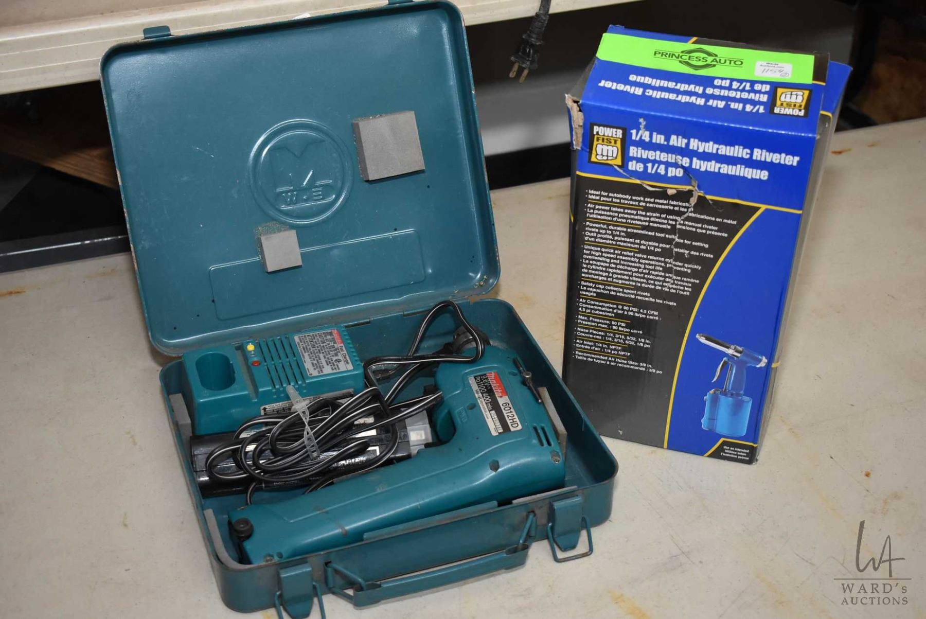 Power Fist 1/2" air hydraulic riveter and a Mikita 6012 HD cordless drill driver and a driver and case, working at time of cataloguing