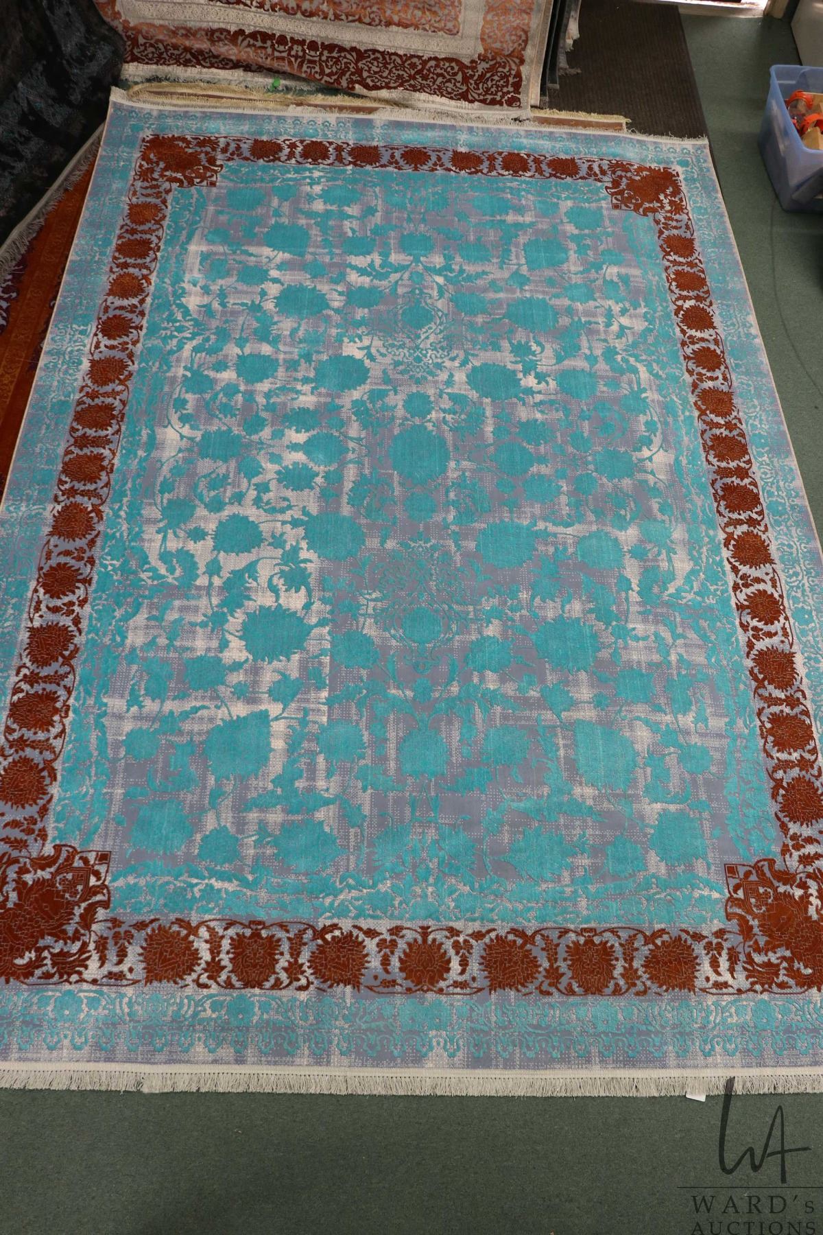 Premium Collection Sizan carpet, polyester, acrylic blend in shades of teal, copper, and pale blue, 98" X 138"