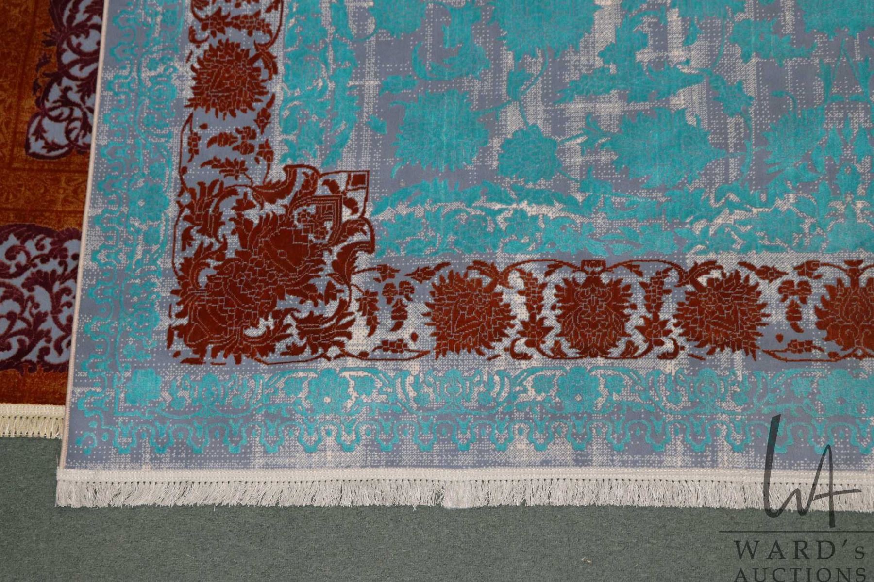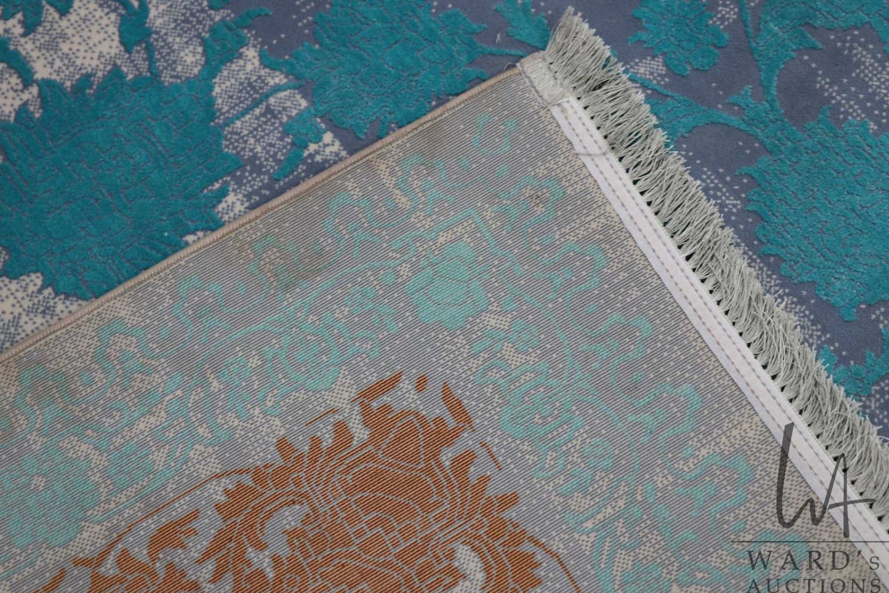 Premium Collection Sizan carpet, polyester, acrylic blend in shades of teal, copper, and pale blue,