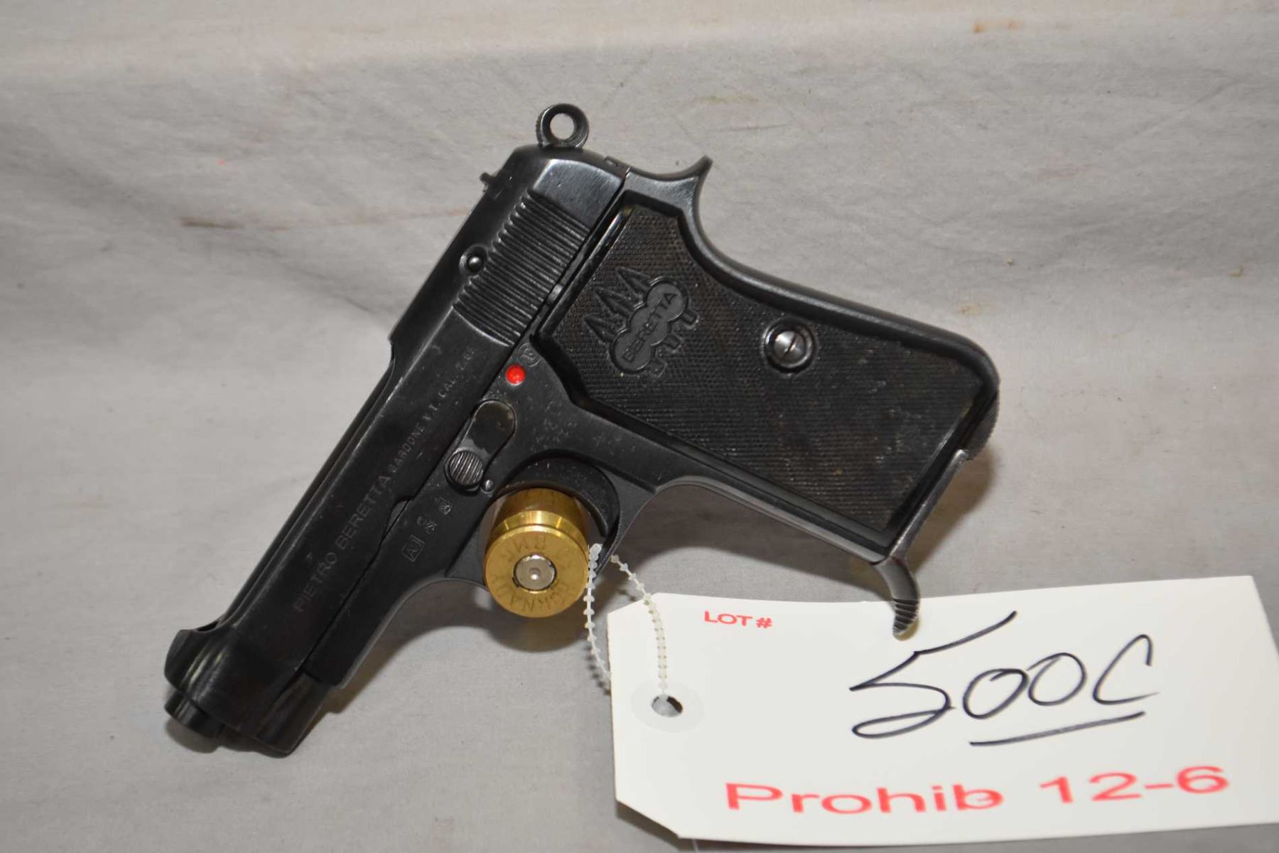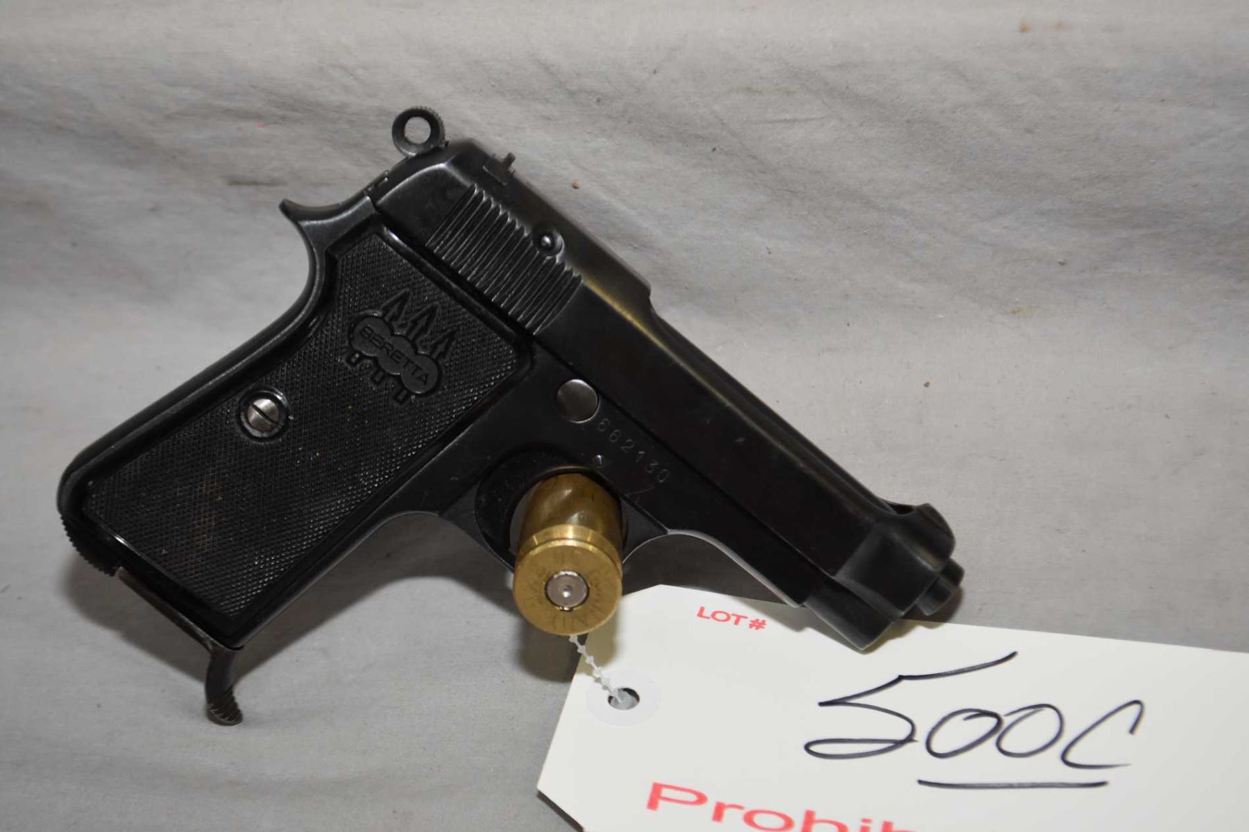Prohib 12 -6 Beretta Model 1935 7.65 MM Cal 8 Shot Semi Auto Pistol w/ 85 mm bbl [ blued finish starting to fade with various marks and scratches, black checkered Beretta grips, also with few marks ] Ser # 662130 Prohib 12- 6 Cert # 5337390 FRT # 16534 -1 EXPECT DELAYS IN TRANSFER
