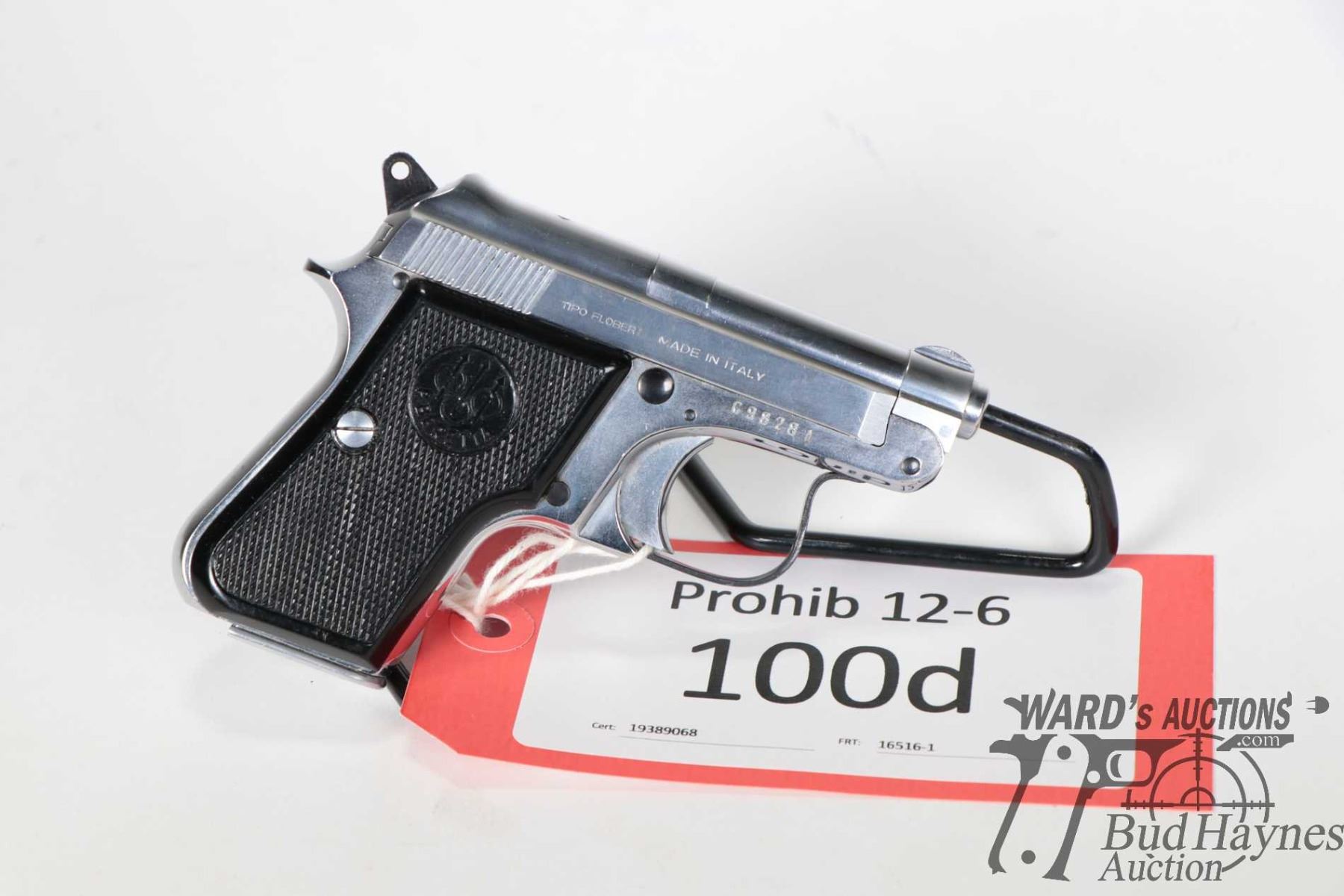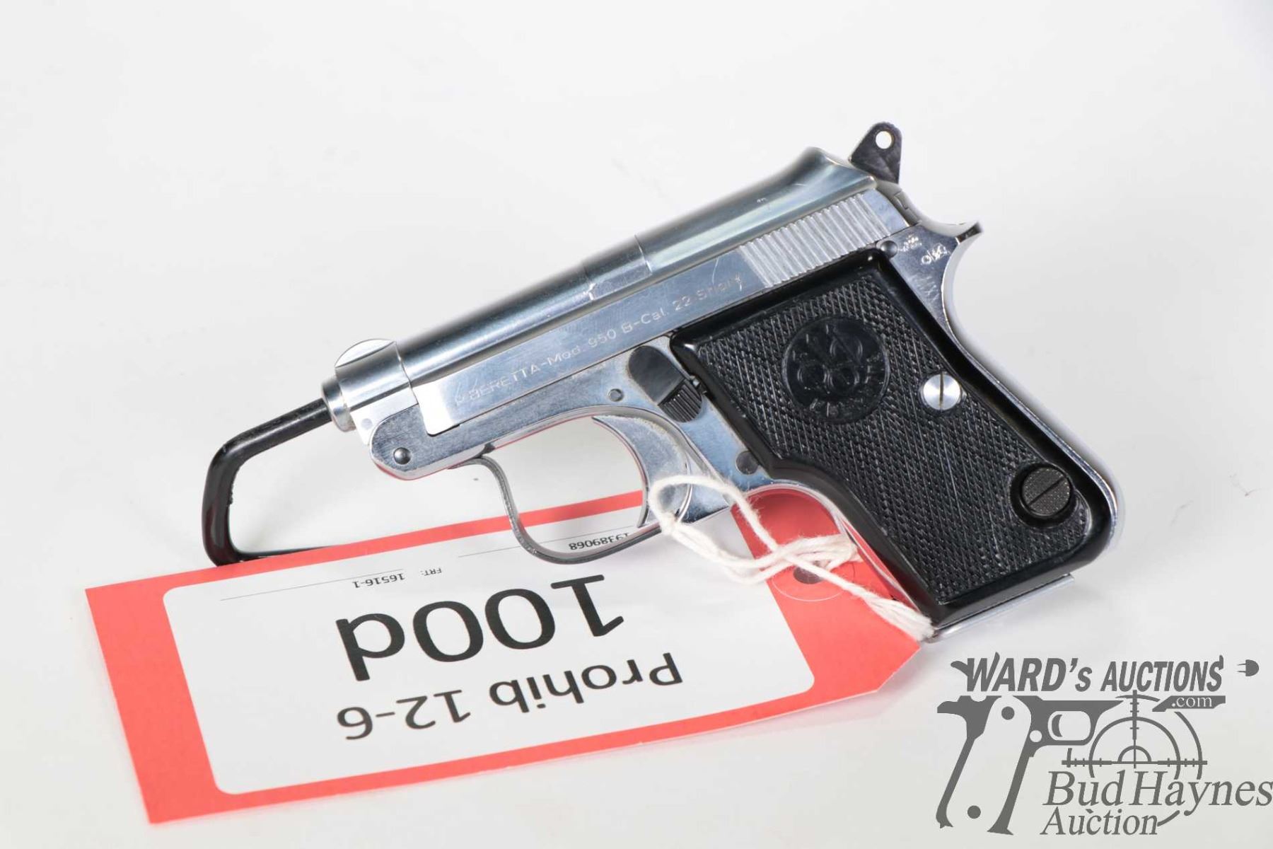 Prohib 12-6 Beretta model 950B, 22 Short 6 Shot w/ bbl length 60mm [Stainless steel, fixed sights, branded plastic grips, include one detachable magazine. Mechanically appears excellent with very little use. Minor use handleing and storage marks.] serial # C98281, certificate # 19389068, FRT # 16516-1. Descriptions subject to change.