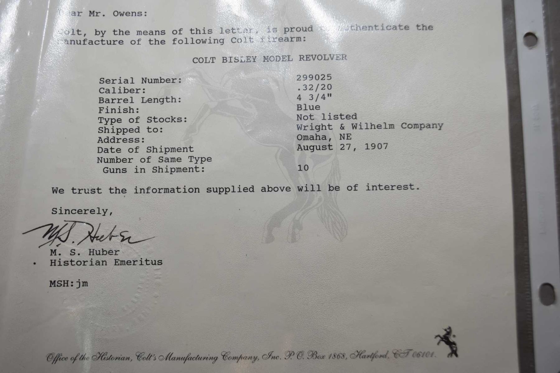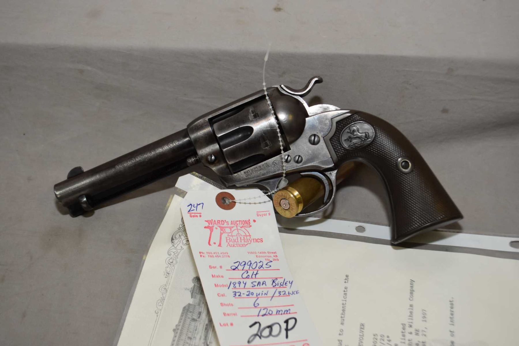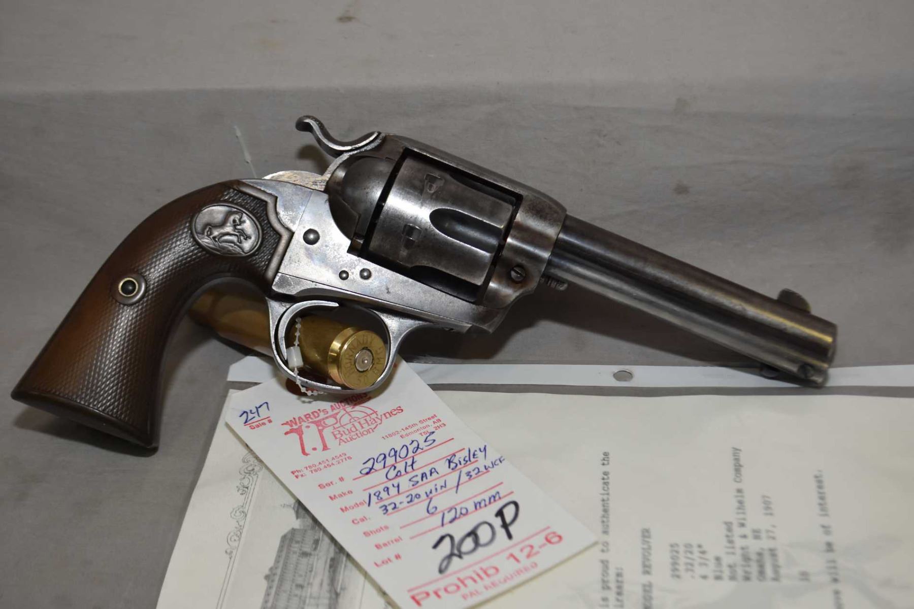 Prohib 12 - 6 Colt Model 1894 Bisley Single Action Army .32 - 20 Win / .32 WCF Cal 6 Shot Revolver w/ 120 mm bbl [ matching numbers, blued finish starting to fade, case color also starting to fade, turning silver and flaking, Colt insignia checkered grips show some wear, Two Line Address, Pat. Sept. 19, 1871, July 2, 72, Jan 19, 75 , Circa 1907, Comes With Colt Factory Letter , Shipped one of ten guns to Wright & Wilhelm Co. Omaha N.E. August 27, 1907 ] Ser # 299025 12 -6 Prohib Cert # 18893713 FRT # 31580 - 11 EXPECT DELAYS IN TRANSFER