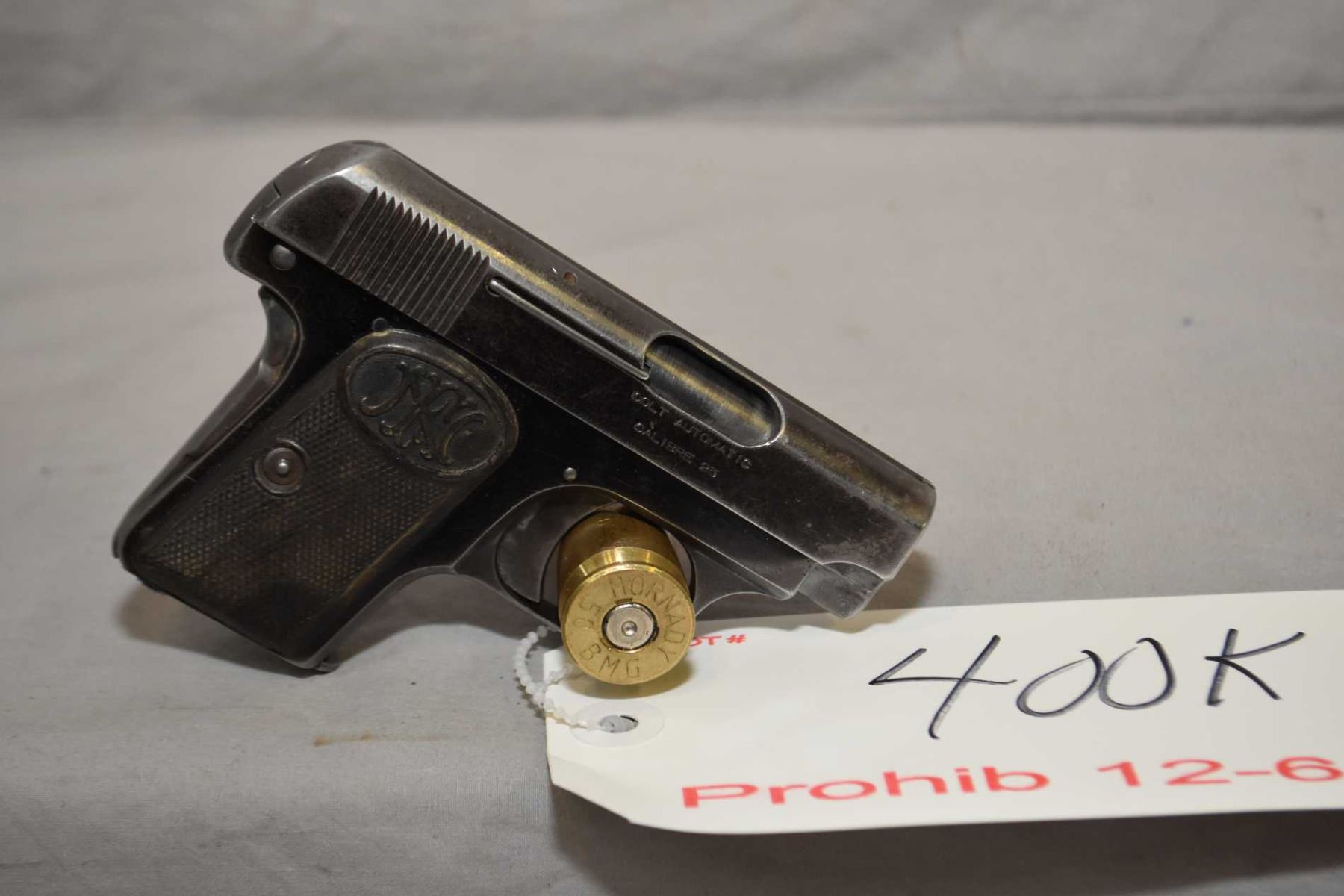 Prohib 12 - 6 Colt Model 1908 .25 Auto Cal 6 Shot Semi Auto Pistol w/ 51 mm bbl [ blued finish, starting to fade with some holster wear, marks and scratches, note : checkered FN grips ] Ser # 91539 Prohib 12 - 6 Cert # 19045232 FRT # 23917 - 1