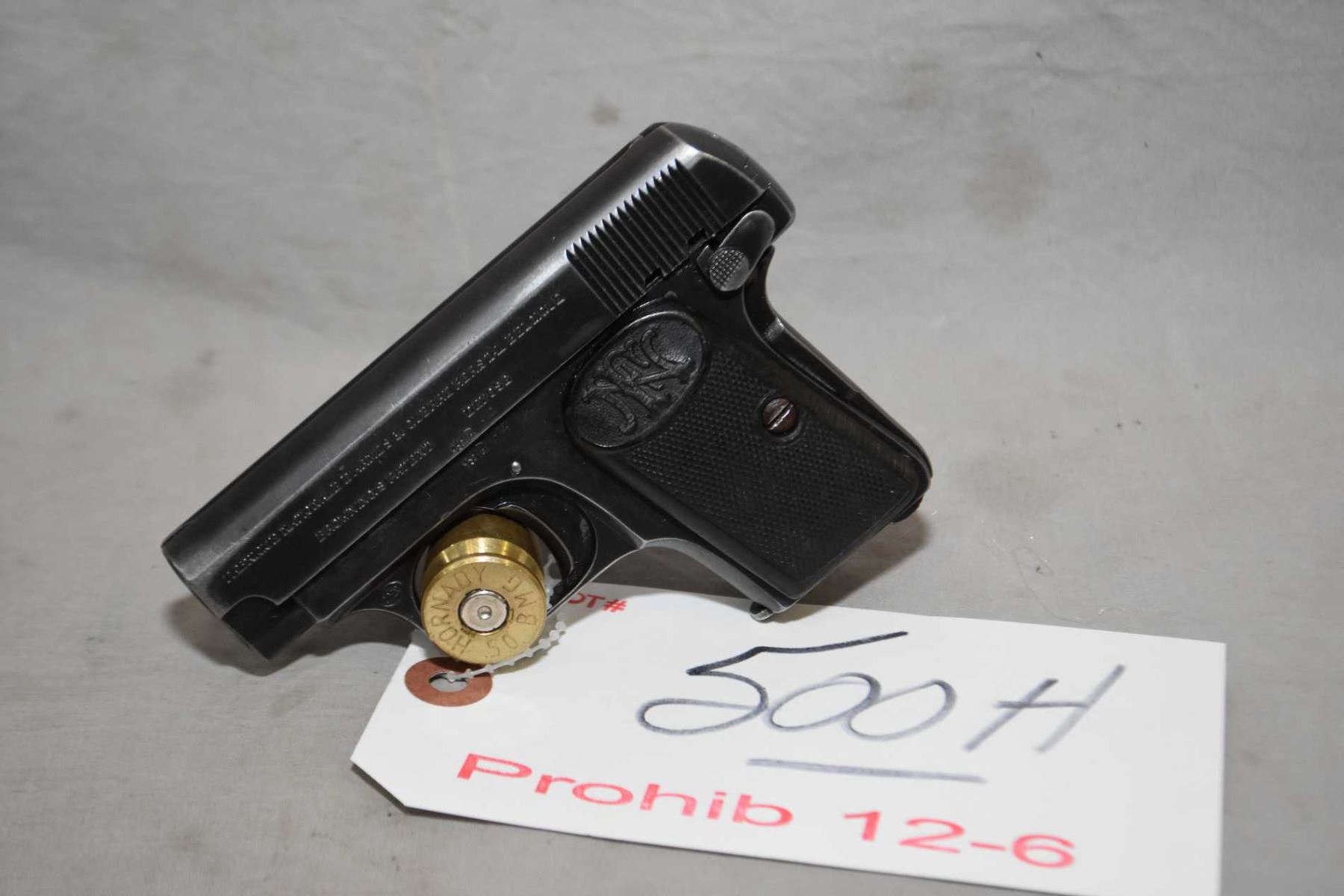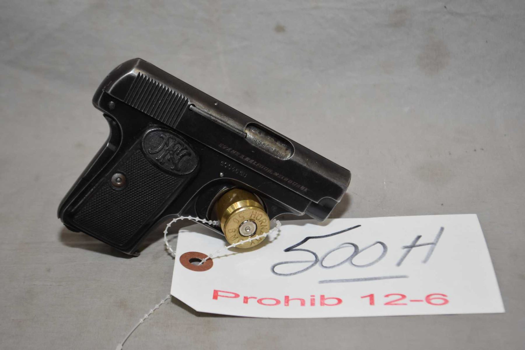 Prohib 12 - 6 F.N. Browning Model 1906 6.35 MM Cal 6 Shot Semi Auto Pistol w/ 54 mm bbl [ blued finish starting to fade with some holster wear, marks and scratches, F.N. checkered black grips also show some wear , right side of slide marked Evans & Balfour, Melburne ] Ser # 1004618 Prohib 12 -6 Cert # 18603041 FRT # 16730 - 1 EXPECT DELAYS IN TRANSFER