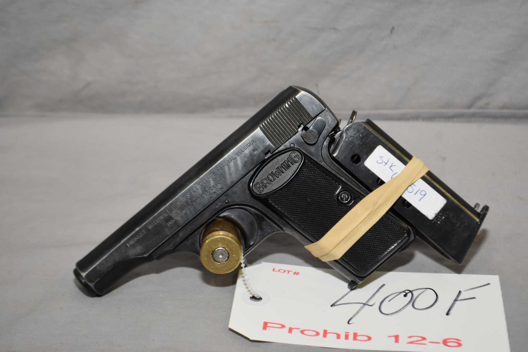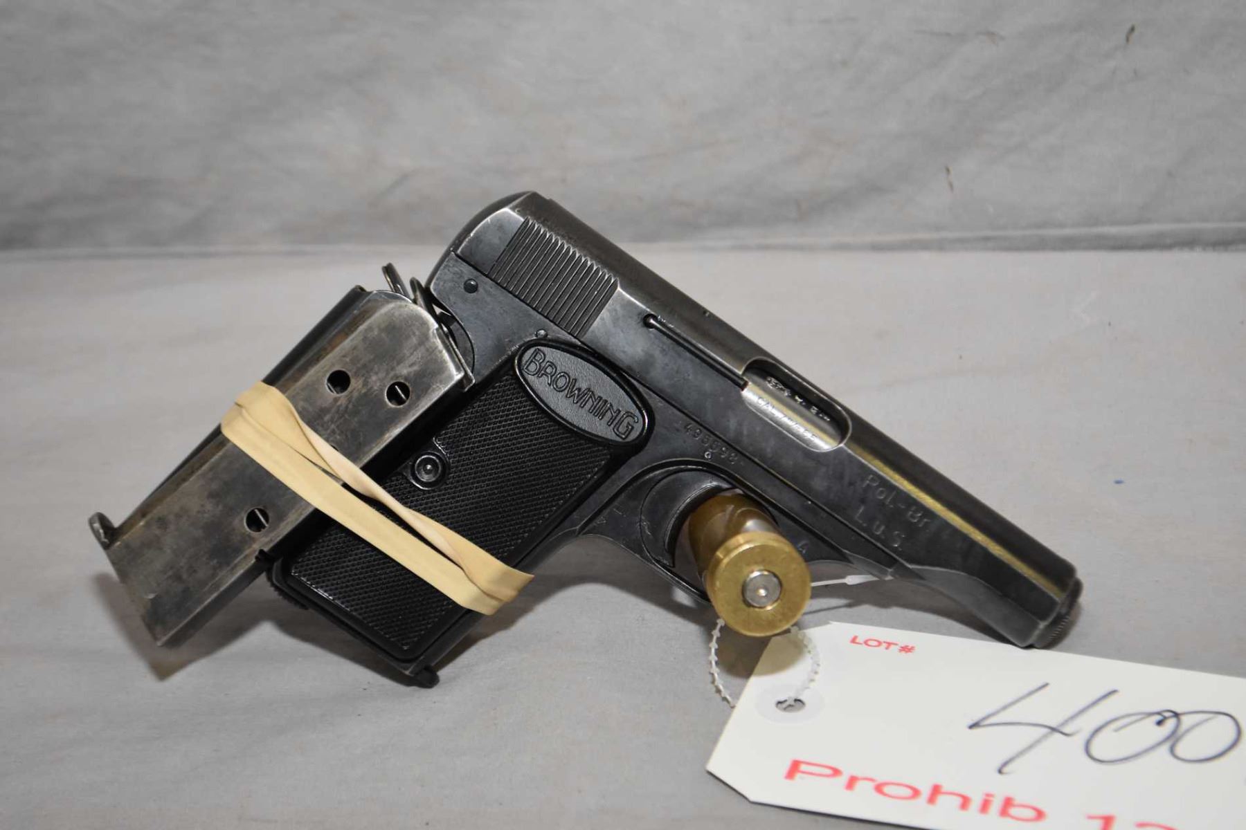 Prohib 12 - 6 F.N. Browning Model 1910 7.65 MM Cal 7 Shot Semi Auto Pistol w/ 89 mm bbl [ blued finish, slight holster wear, black checkered Browning grips, note : right side slide stamped Pol.- Br. over L.u.S., with two extra mags ] Ser # 495598 Prohib 12 - 6 Cert # 18884169 FRT # 36203 - 1 EXPECT DELAYS IN TRANSFER
