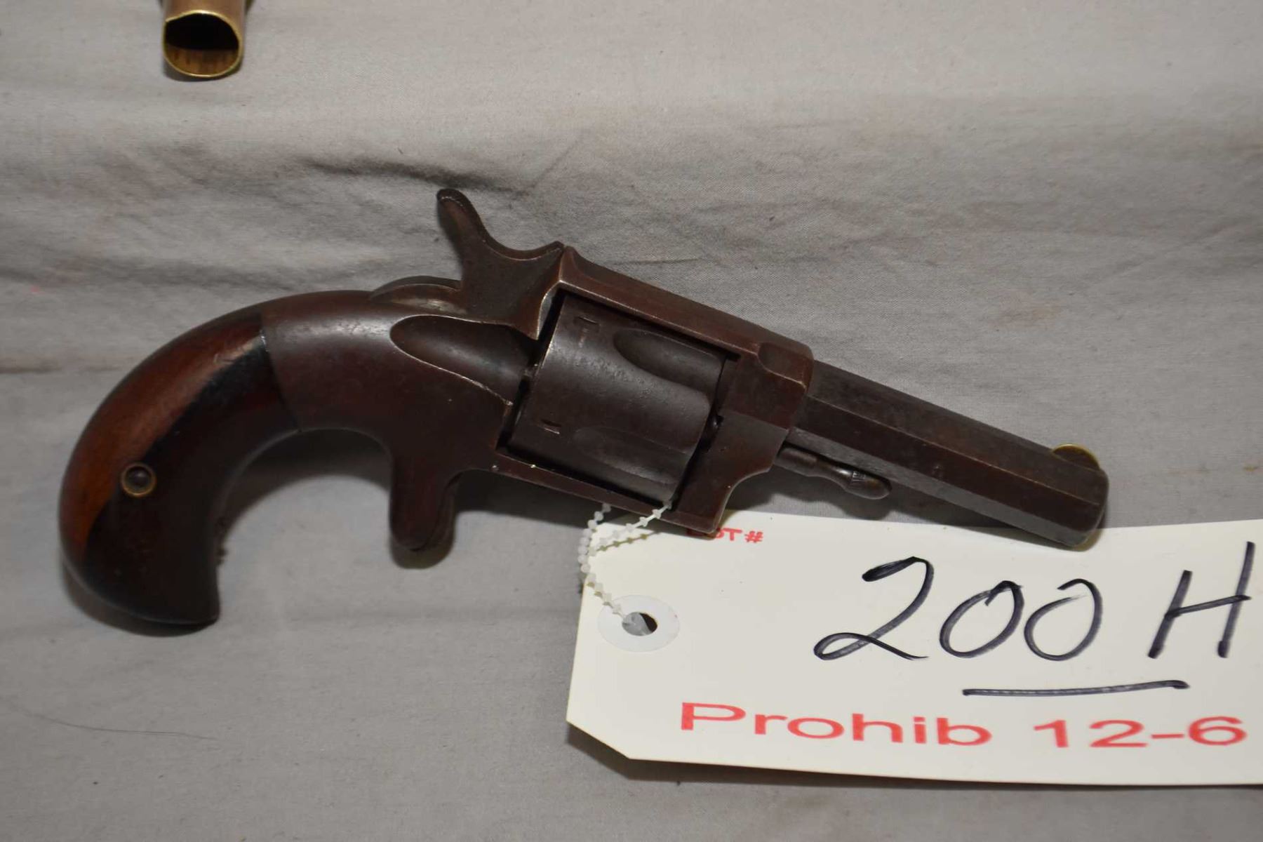 Prohib 12 - 6 Hopkins & Allen Model XL No.4 .38 Rimfire Cal 5 Shot Revolver w/ 76 mm bbl [ Note : Is in Antique Class but is now registered as a Prohib 12 - 6, the successful buyer can contact the government to de - register, but it is registered as Prohib 12 -6 at this time, blued finish turned brown, traces of flaking case color turned silver on hammer, spur trigger, walnut bird's head grips, with few marks and scratches ] Ser # 1147 Prohib 12 -6 Cert # 7622023 FRT # 19932 - 10 ANTIQUE EXPECT DELAYS IN TRANSFER