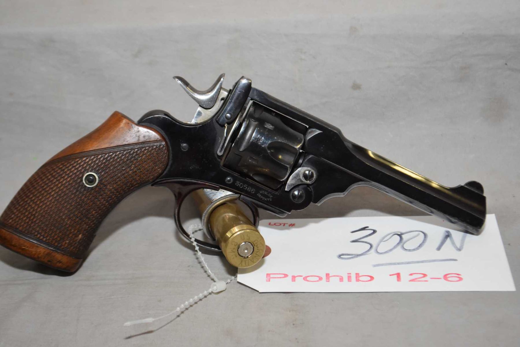 Prohib 12 - 6 Webley Model Mark III .38 S & W Cal 6 Shot Revolver w/ 102 mm bbl [ blued finish, various proof marks, also faint cylinder ring and other marks, checkered walnut grips with some marks ] Ser # 30586 Prohib 12 - 6 Cert # 15319686 FRT # 64184 - 10