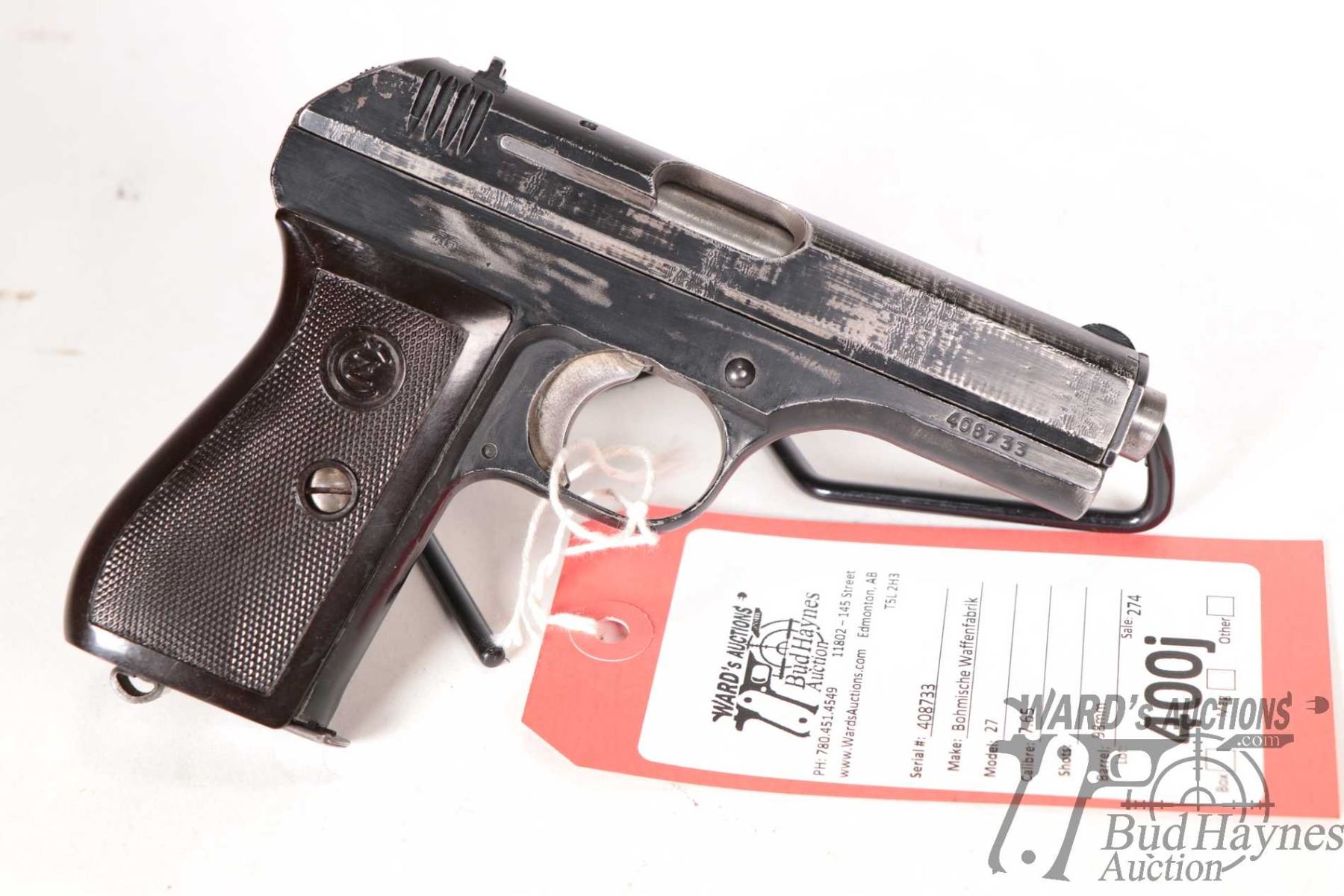 Prohib 12-6 handgun Bohmische Waffenfabrik model CZ 27, 7.65 mm semi automatic, w/ bbl length 98mm [Heavy black finish on slide and receiver. Fixed sights. CZ branded checkered grips. Includes one detachable magazine. Matching serial numbers on slide and receiver. C 1943. Mechanically seems loose and well used and finish is inexplicable.] serial # 408733, certificate # 18257966, PAL required