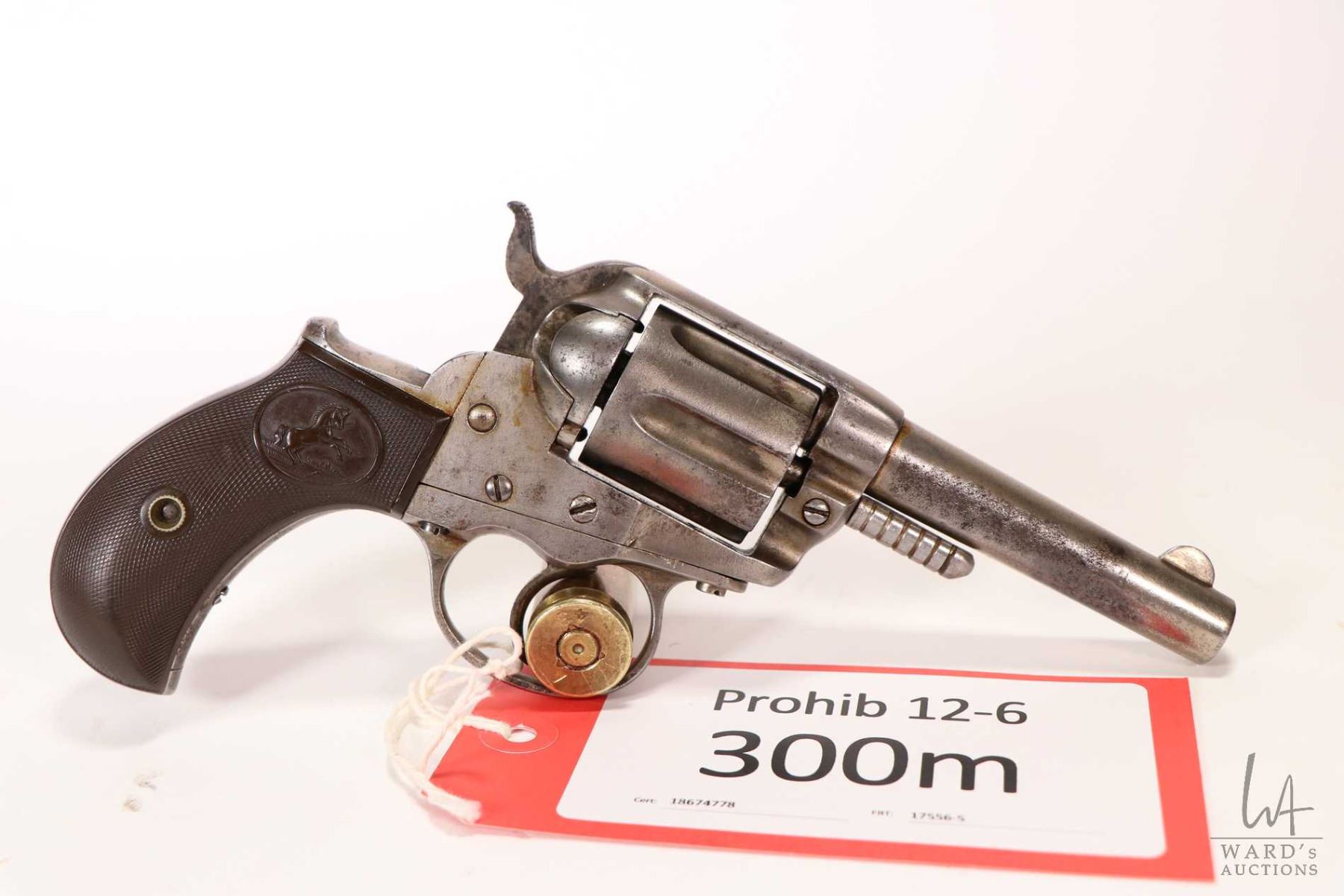Prohib 12-6 handgun Colt model 1877 Lightening, .38 Long six shot double action revolver, w/ bbl length 89mm [Nickel finish with fixed sights. Branded checkered plastic grips. Mechanically in poor condition, cylinder does not index, hammer does not lock, likely parts missing inside. Bid as project or parts gun.] serial # 58538, No PAL required