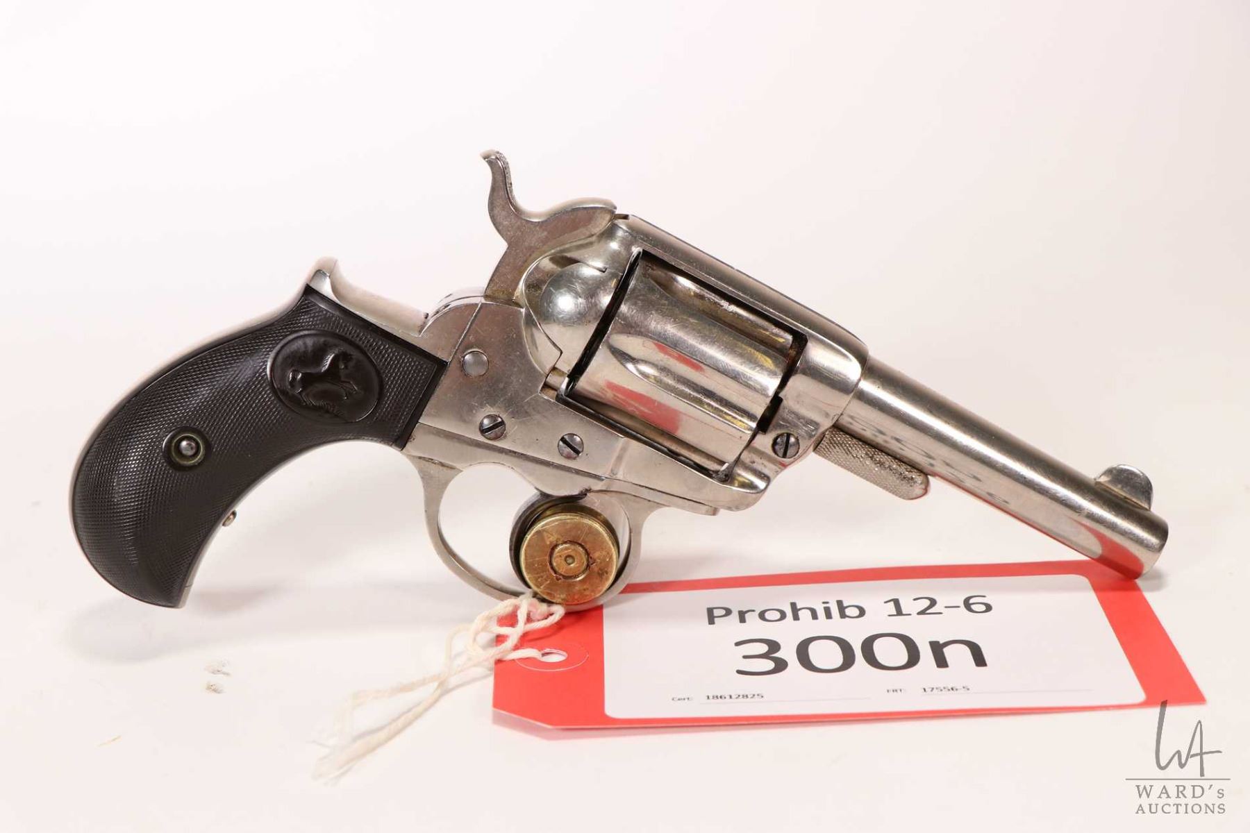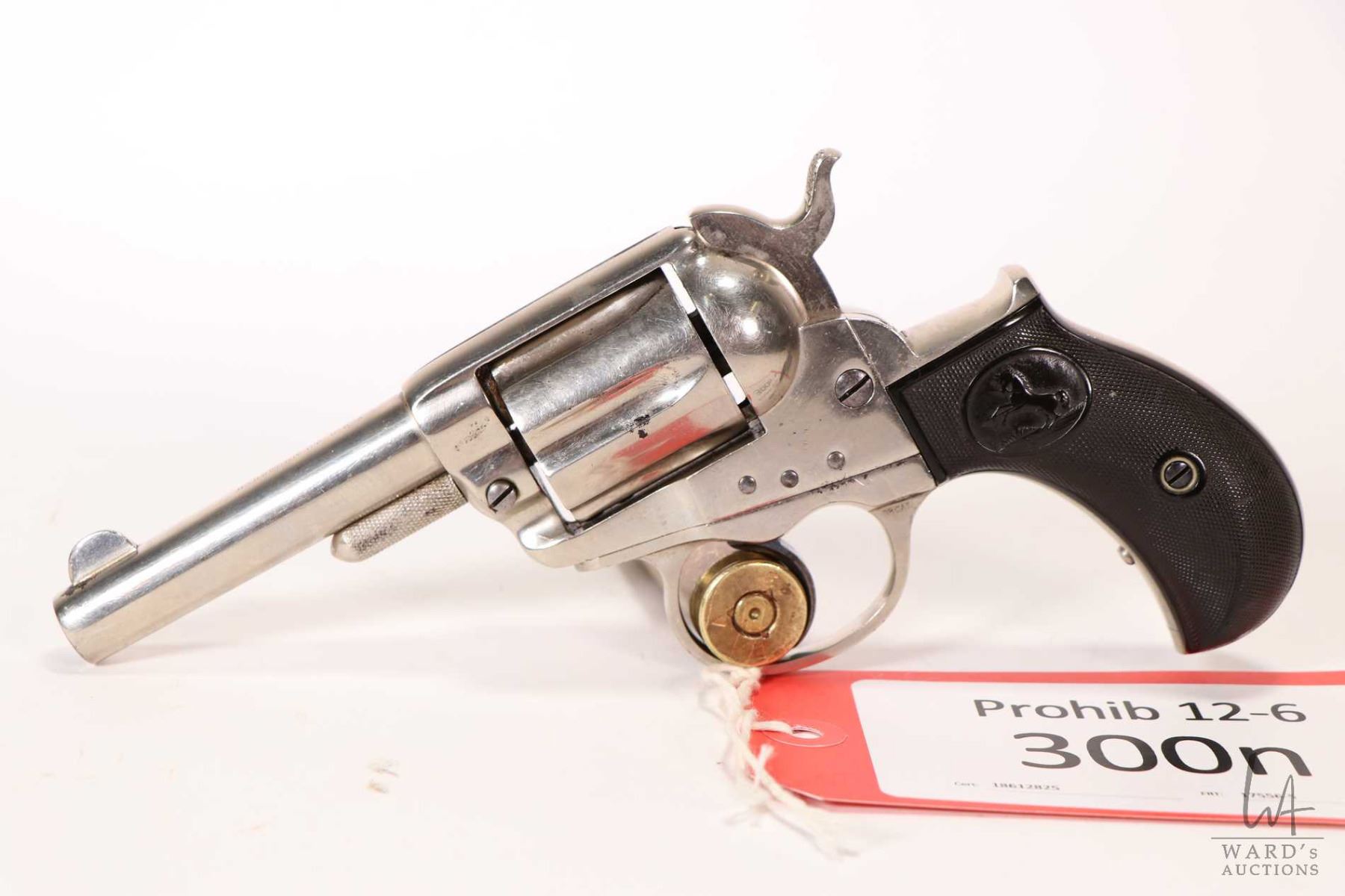 Prohib 12-6 handgun Colt model 1877 Lightening, .38 Long six shots double action revolver, w/ bbl length 89" [Nickel plated finish with fixed sights and branded checkered grips. Most plating intact with some expected pitting and marks. Action is a bit stiff but does index consistently. Use, handling and storage marks.] serial # 27981, PAL required