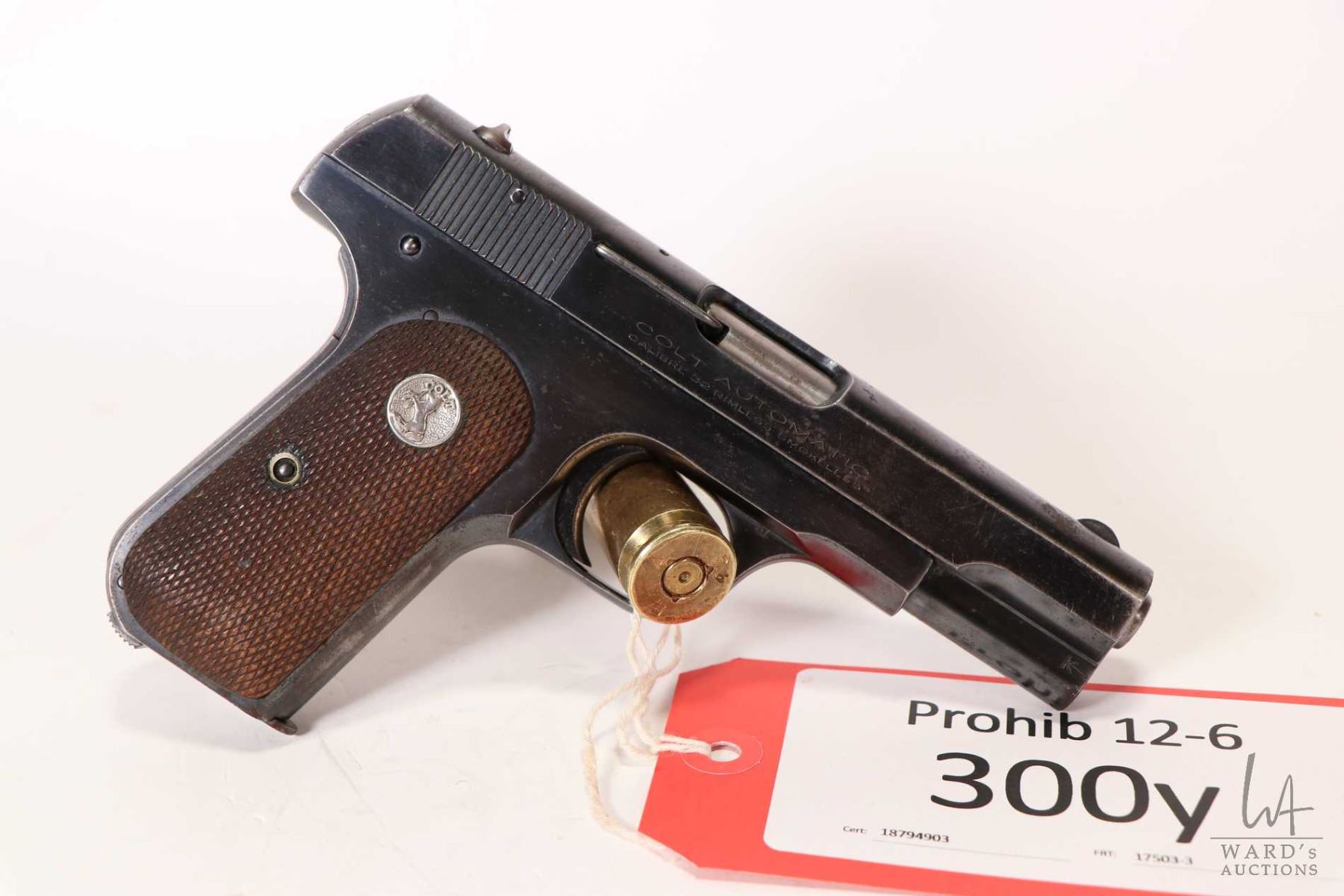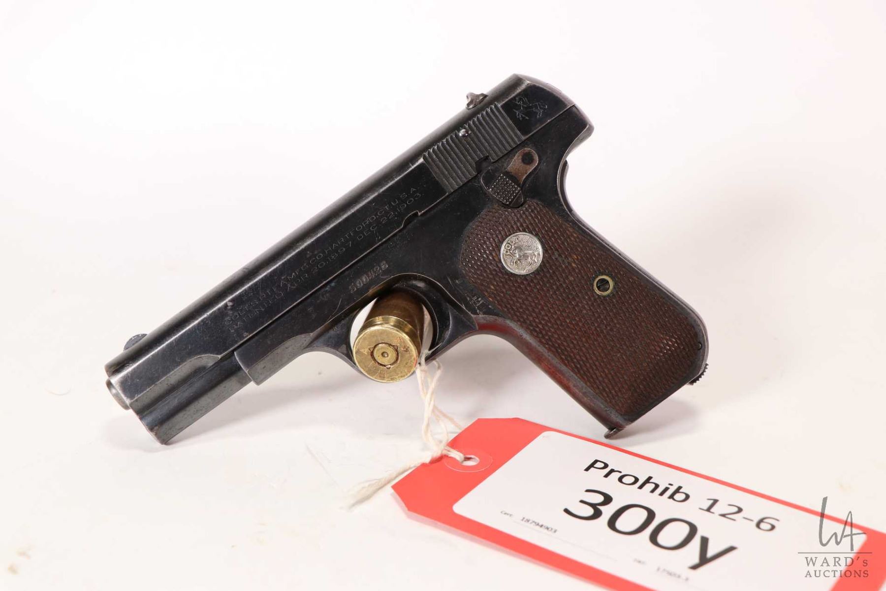Prohib 12-6 handgun Colt model 1903 Pocket Hammerless, .32 auto eight shot semi automatic, w/ bbl length 95mm [Blued finish. Fixed front and rear sights. Checkered wooden grips. Bluing worn in holster and handling. Use, handling and storage marks on wood and metal. Includes one detachable magazine.] serial # 500426, PAL required