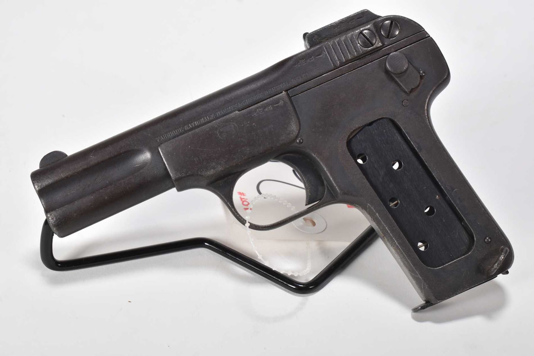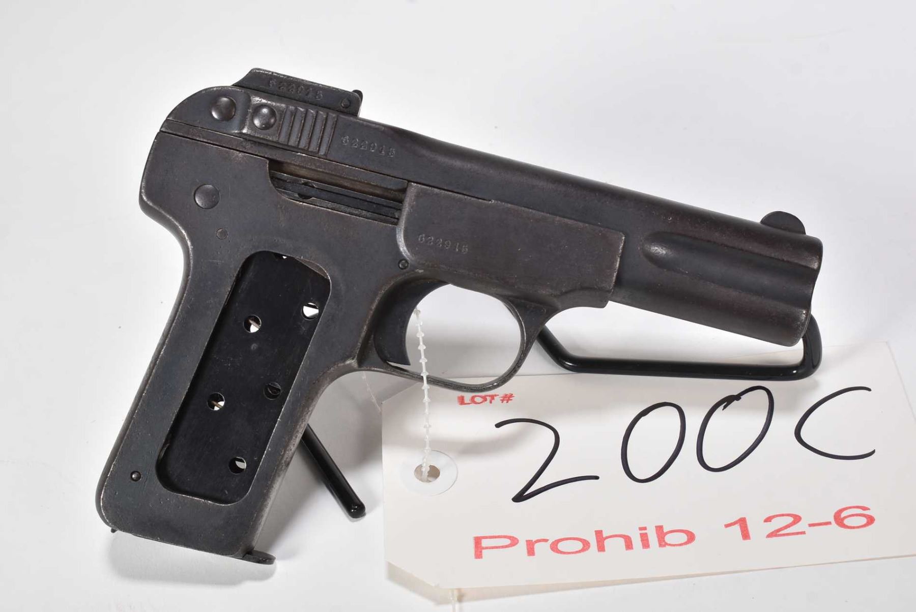 Prohib 12-6 handgun FN-Browning model 1900, 7.65mm mag fed seven shot semi automatic, w/ bbl length 102mm [Blued finish turning brown grey, fixed sights, missing grips. Includes one detachable magazine. Well worn and well used condition] serial # 622915, certificate # 12012772, FRT # 16739-2 PAL required