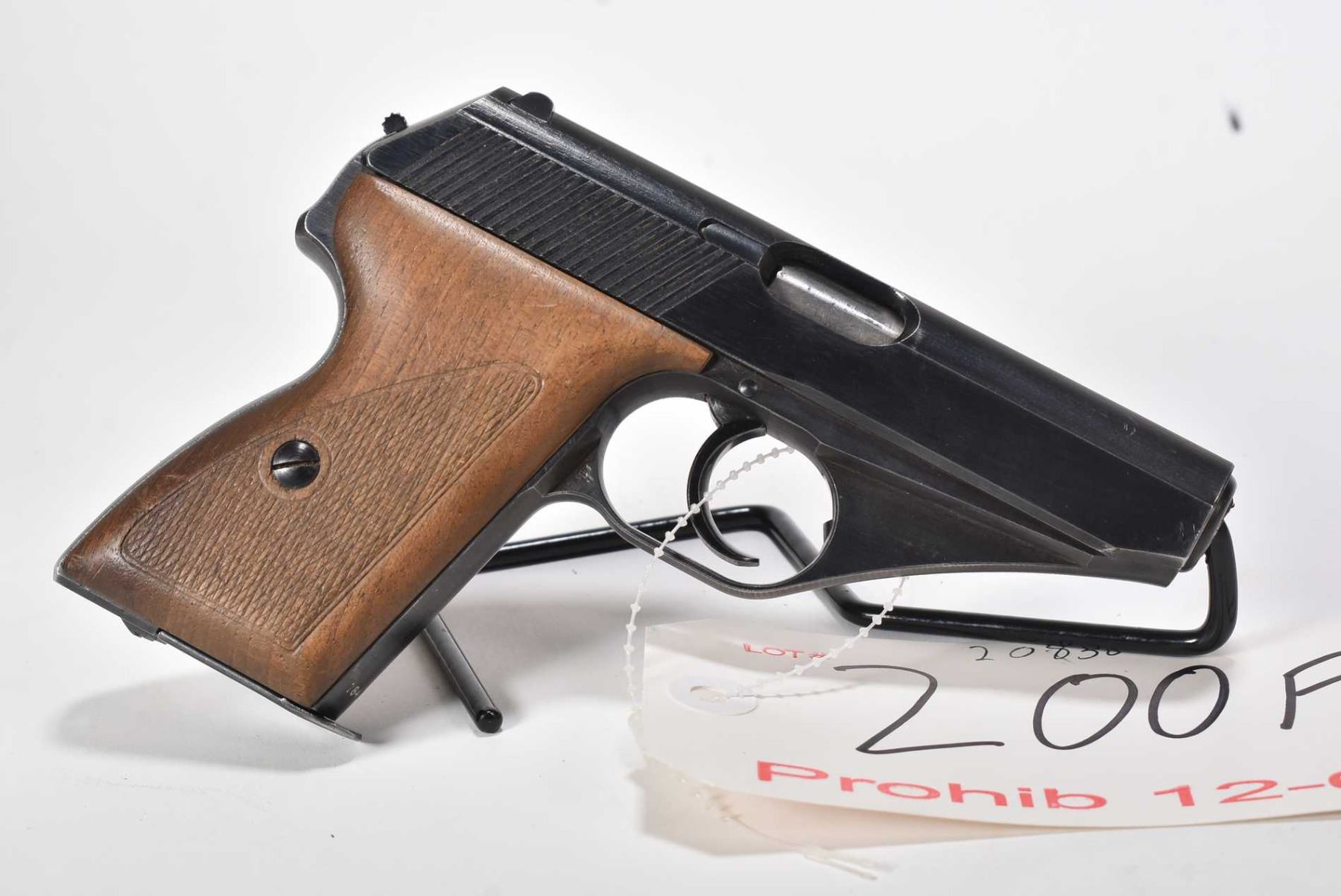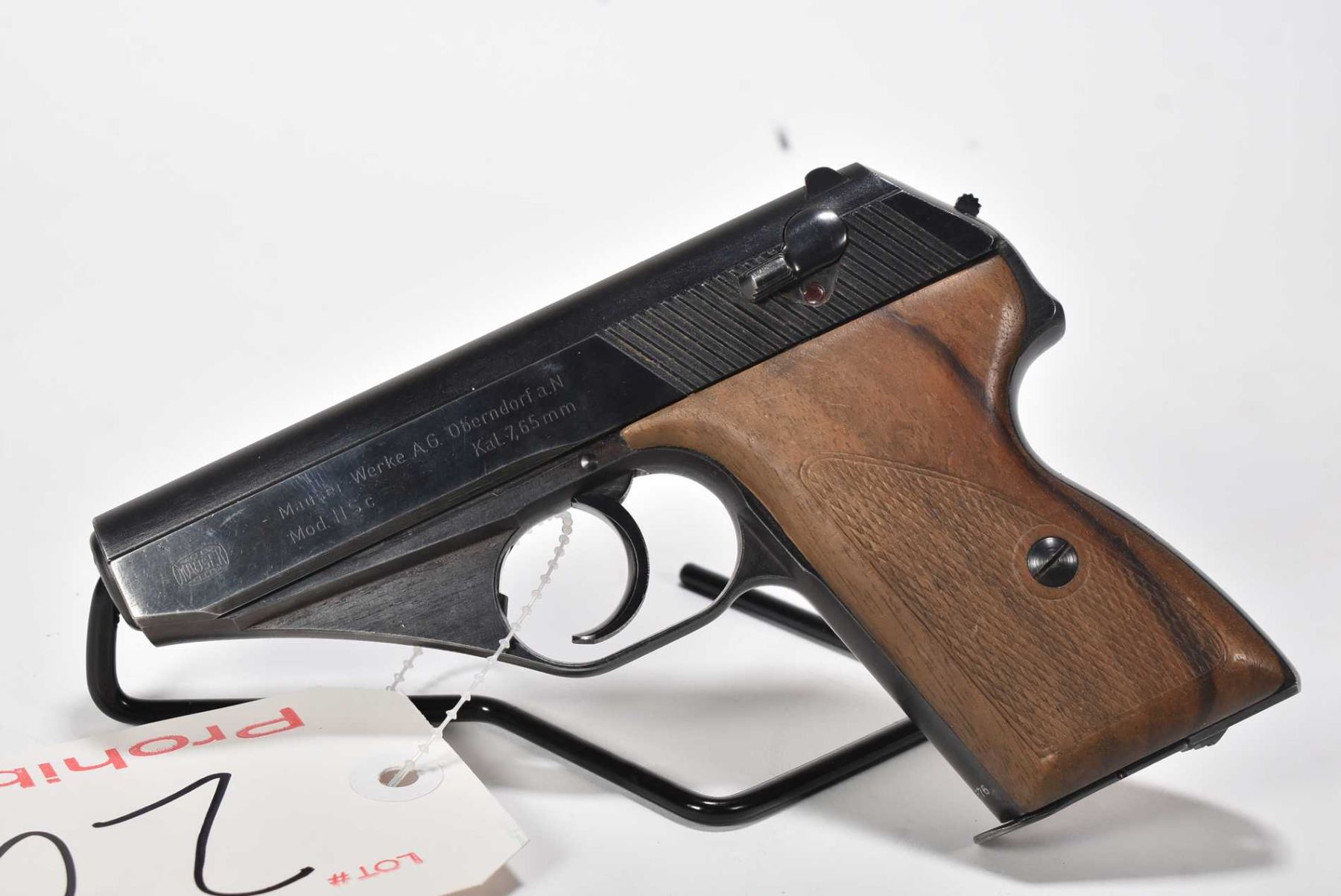 Prohib 12-6 handgun Mauser model HSC, 7.65mm eight shot semi automatic, w/ bbl length 86mm [Blued finish, fixed sights, checkered wooden grips. Includes one detachable magazine. Wear in expected use and holster areas] serial # 784676, certificate # 9429341, FRT # 20860-1 PAL required