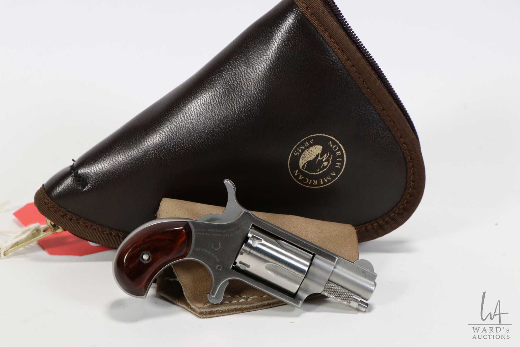 Prohib 12-6 handgun North American Arms Co. model NAA22MS, .22 LR five shot single action revolver, w/ bbl length 29mm [Stainless steel with fixed sights. Smooth wooden grips. Very slight cylinder ring, otherwise appears to have had virtually no use. Includes original branded leather holster and gun pouch.] serial # V81194, certificate # 5081094, FRT # 21085-4 PAL required