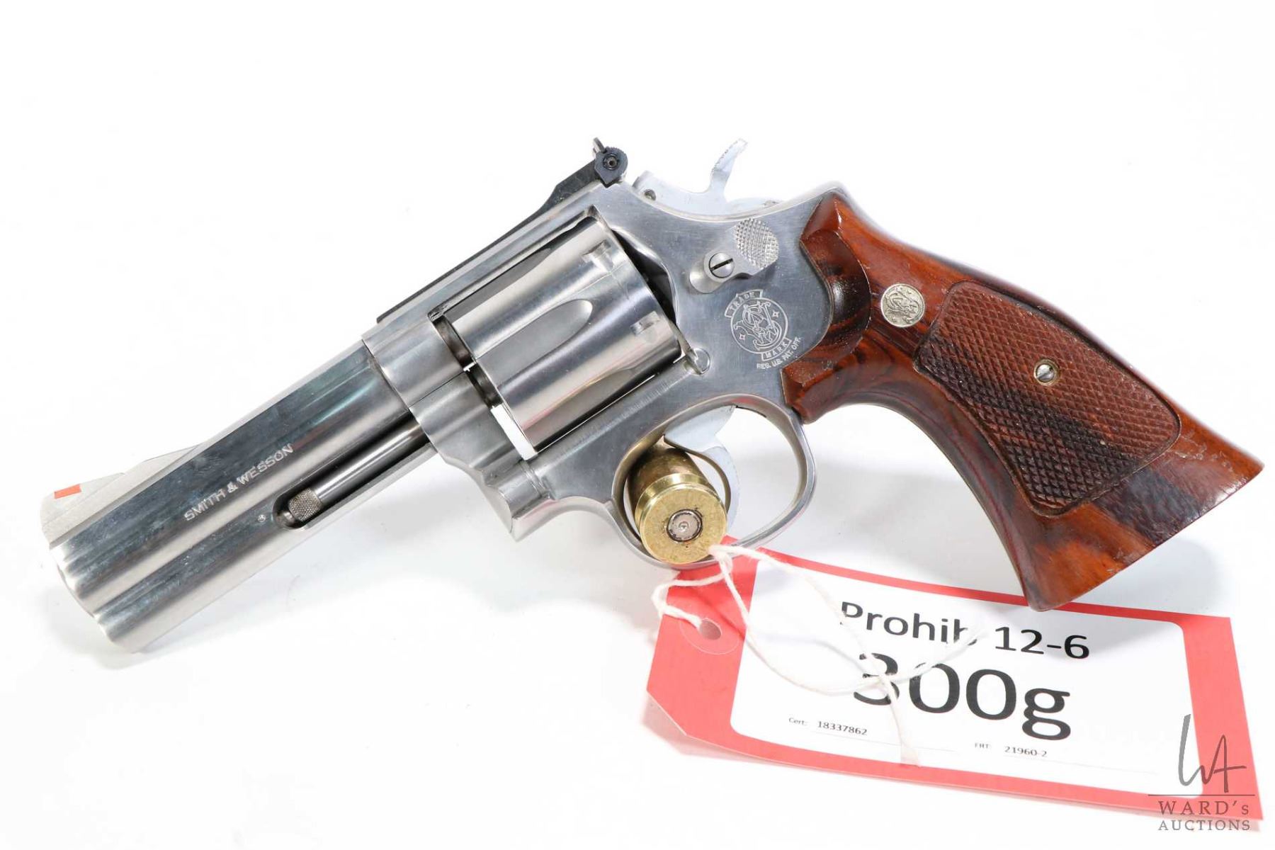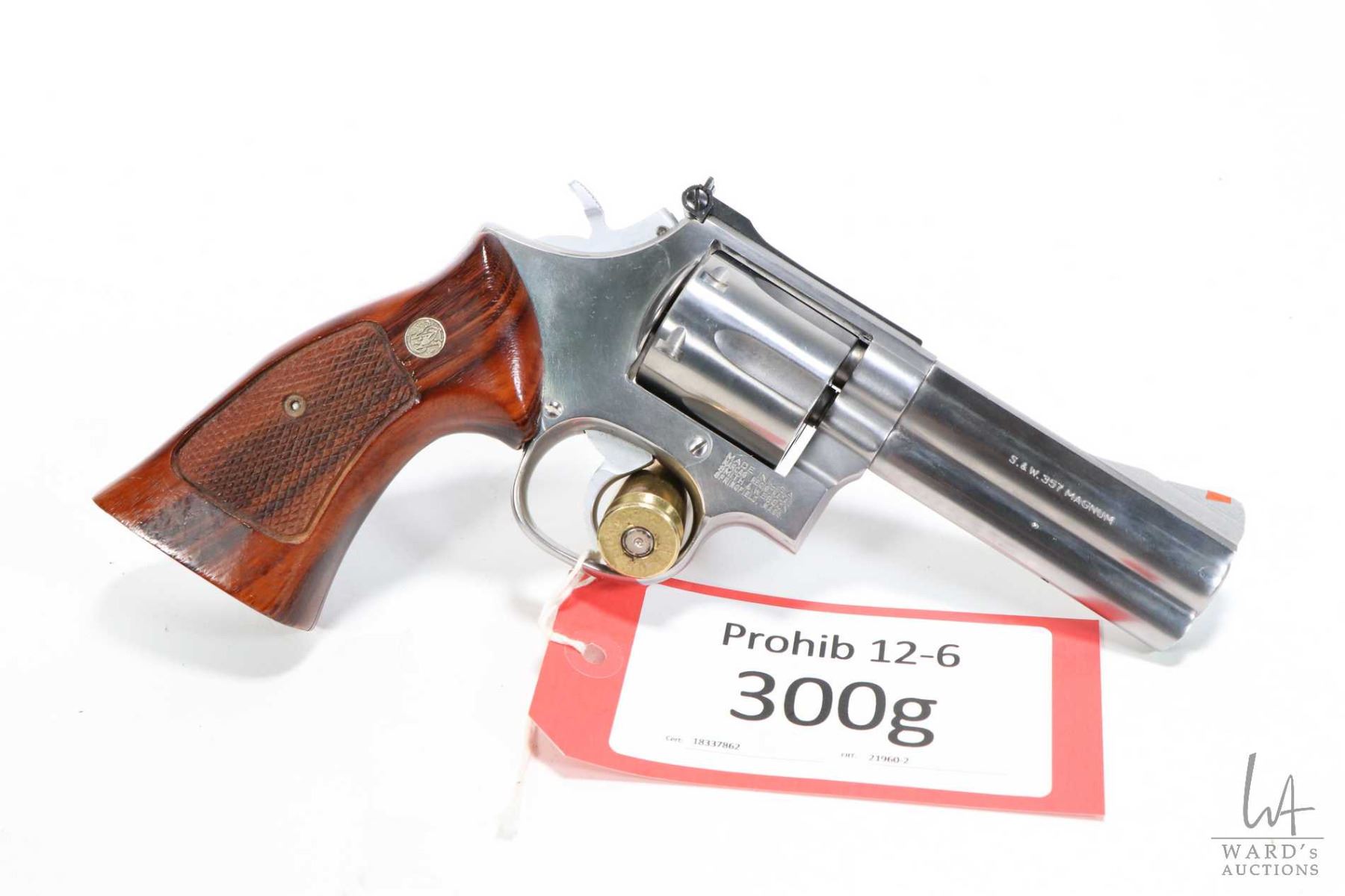 Prohib 12-6 handgun Smith & Wesson model 686-3, .357 Mag six shot double action revolver, w/ bbl length 102mm [Stainless steel with fixed front and adjustable rear sights. Branded checkered wooden grips. Very slight cylinder ring, appears to have had very light use with only minor use, handing and storage marks.] serial # BDR3475, certificate # 18337862, FRT # 21960-2 PAL required