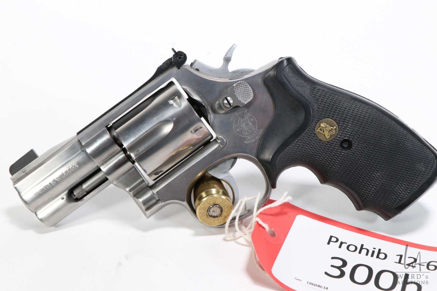 Prohib 12-6 handgun Smith & Wesson model 686-3, .357 Mag six shot double action revolver, w/ bbl length 64mm [Stainless steel with fixed front and adjustable rear sights. Pachmayr Gripper rubber grips with finger grooves. Visible cylinder ring and in otherwise use condition but mechanically seem excellent including indexing. Use, handling and storage marks.] serial # BKK6936, certificate # 18604634, FRT # 21960-1 PAL required