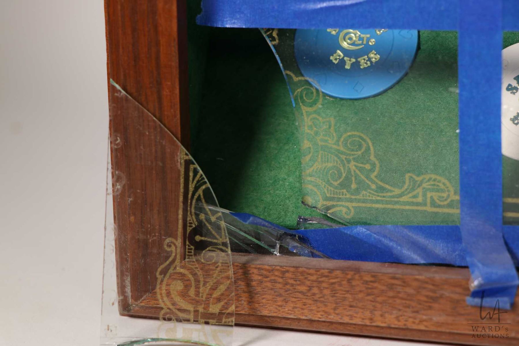 Prohib 12-6 handguns Colt model Snake Eyes X 2, .357 Magnum six shot double action revolver, w/ bbl length 63" [Matched set of Colt Python Snake Eye revolvers including one in stainless steel and one in polished blue finish. Both having fixed front and adjustable rear sights. Smooth faux ivory two piece grips with scrimshaw snake eyes dice roll on left side and a Royal flush on the right. Both appear to be unfired or possibly factory test fire, each with very slight cylinder ring. This 1989 limited of 500 set comes with custom gambler's motif illuminated display case with Colt branded chips and dice. See photos. Note blue strips are protective tape however glass has small break to bottom left corner. Original boxes for the revolvers including manual and hanging tags included and shipping box for display case.] serial # 220EYES EYES220, PAL required