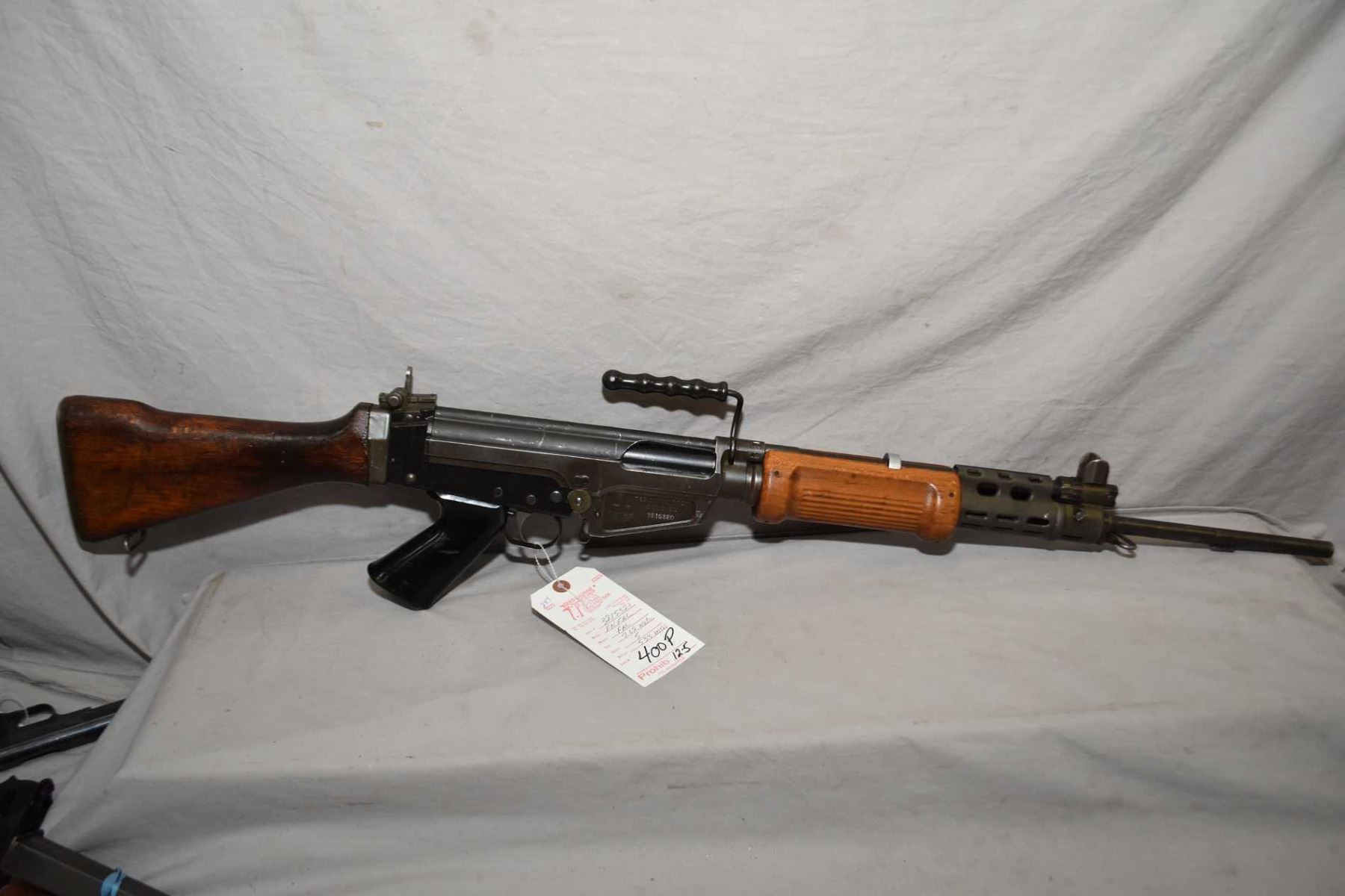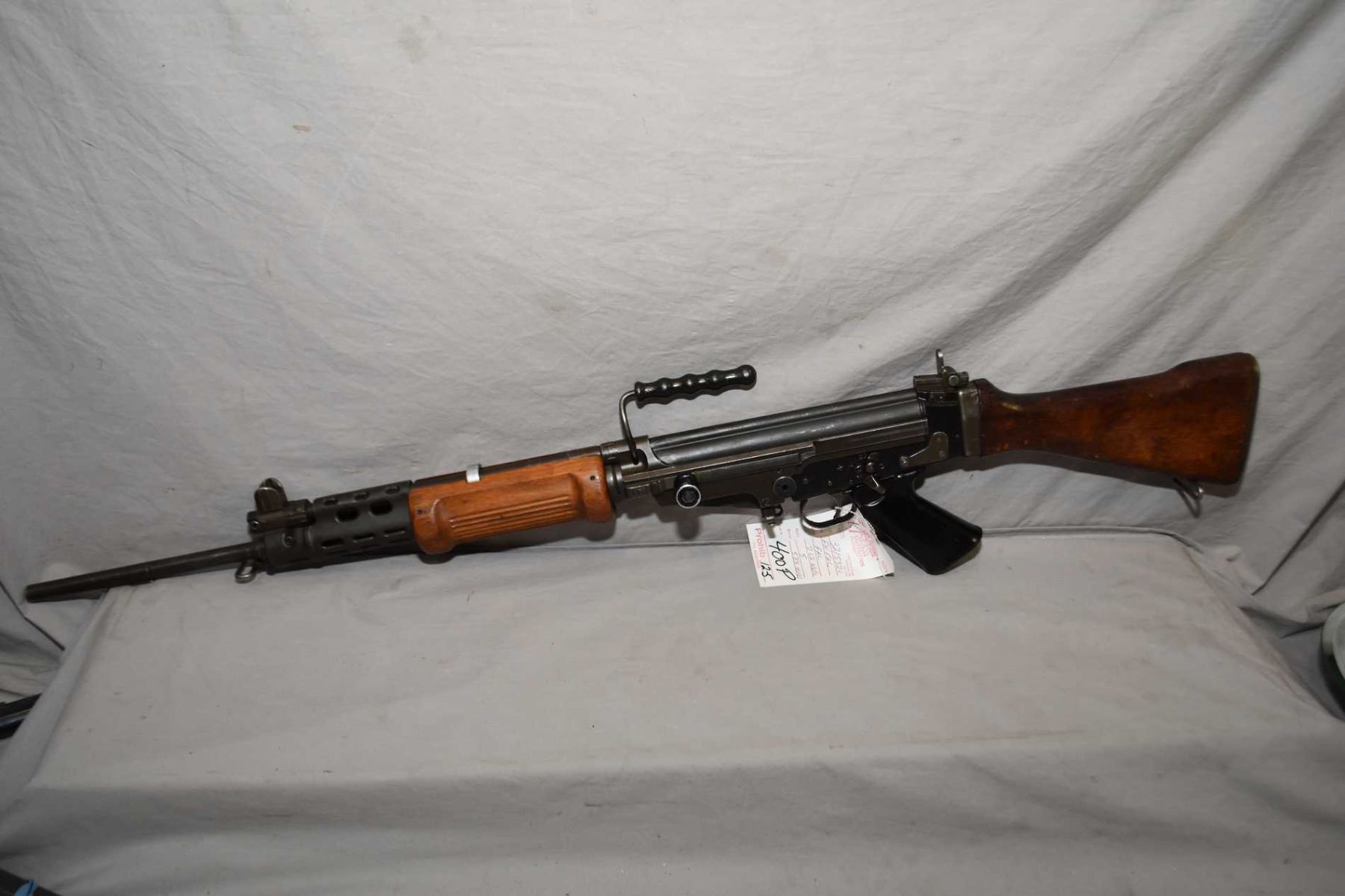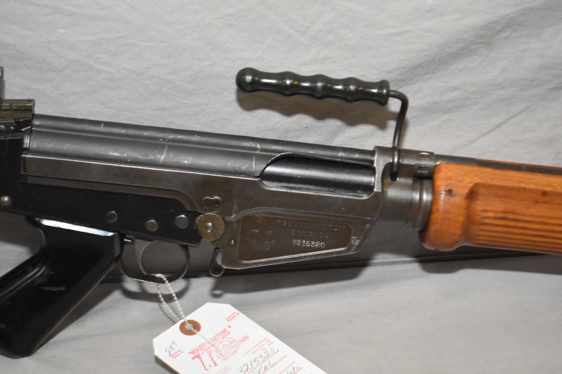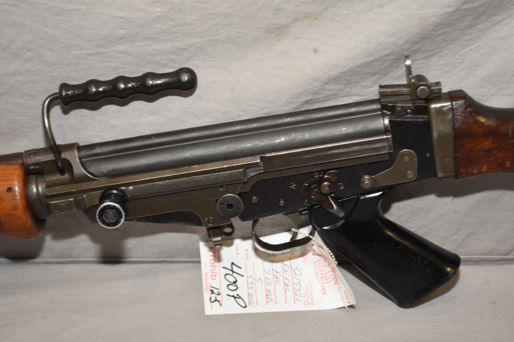 Prohib Class 12 - 5 FNFAL ( Fabrique Nationale Herstal ) Model FAL ( Israeli Marked ) 7.62 Nato Cal 5 Shot Semi Auto Mag Fed Military Rifle w/ 533 mm bbl [ greenish war finish, composite pistol grip and carry handle, wooden butt stock and forend, with sling swivels, note : no mag, barrel sights, examined by RCMP Laboratories Case No. 94 - 1309 Examiner A.J. Voth Dated Received 94/08/18 one of one, c/w foam lined plastic rifle case ] Ser # 3215320 Prohib Class 12 - 5 Cert # tci FRT # 19210 - 1 EXPECT DELAYS IN TRANSFER