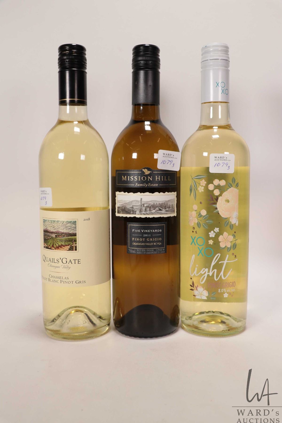 Quails' Gate/ 2018/ Pinot Gris/ 750ml/ 12% ABV, Mission Hill/ 2011/ Pinot Grigio/ 750ml/ 12% ABV and XoXo/ Light Pinot Grigio/ 750ml/ 8% ABV Note: Alcohol cannot be insured by any courier in Canada. Local pick up is recommended. Canadian buyers only.